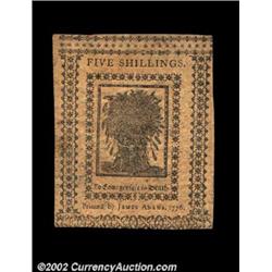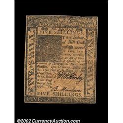 Delaware January 1, 1776 5s About New. Closely margined all around and with a light center fold. Important notice: We expect to be auctioning lots at the rate of 200-250 per hour. Sometimes eBay Premier live bid software cannot keep up with that pace, so we strongly recommend that you place a realistic proxy bid now as insurance to avoid disappointment. Also please note that all Heritage/CAA lots purchased through eBay Premier carry a 20% Buyer's Premium. Please make sure you read the Terms and Conditions.