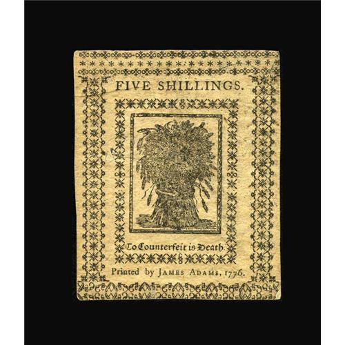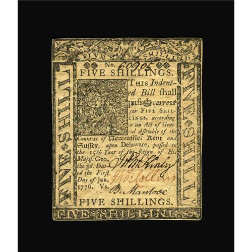 <B>Delaware January 1, 1776 5s Choice New.</B></I> The signatures are dark on this nicely preserved example.<BR><BR><b>Shipping:</b> Coins & Currency (<a target="_blank" href="http://www.heritageauctions.com/common/shipping.php">view shipping information</a>)