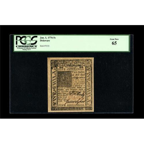 <B>Delaware January 1, 1776 5s PCGS Gem New 65.</B></I> This broadly margined and bright note would make a lovely representative for type.<BR><BR><b>Shipping:</b> Coins & Currency (<a target="_blank" href="http://www.heritageauctions.com/common/shipping.php">view shipping information</a>)
