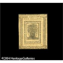 Delaware "January 1, 1776" 5s Very Choice New. The <B>Delaware "January 1, 1776" 5s Very Choice New.</B></I> The margins are close all the way around but this nice Delaware note is otherwise perfect. <BR><BR><B>Important notice:</B> Heritage usually auctions material at the rate of 200-250 lots per hour. On some occasions eBay Live bid software or the Internet may not be able to keep up with the pace of the auction. We recommend placing a realistic absentee bid now as insurance to avoid disappointment. Occasionally the auctioneer may eliminate or reject an eBay Live bid, and the auctioneer may also reopen a lot after the close of the eBay live bidding (usually because we missed an audience bid), and may reject your bid even if it shows you as the winning bidder. By bidding via eBay Live, you agree that Heritage may award the lot to another bidder at its sole discretion under the circumstances described above or any other reasonable circumstances. Since eBay bids are not shown to us until we open the lot on the floor, we treat those bids just like floor bids. In most cases the floor responds before the eBay bid is presented to us, due to Internet lag time, so for consistency we have made it a policy that floor bids are always considered first over tie eBay live bids. Also please note that all Heritage lots purchased through eBay Live carry a 20% Buyer's Premium. Please make sure you read the Terms and Conditions before you bid. This lot is being auctioned in conjunction with a live floor auction by Heritage Galleries & Auctioneers. All final auction and invoice information will be supplied by Heritage Galleries & Auctioneers, and all other information should be considered preliminary. Lot:15108