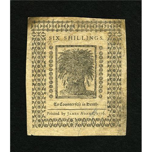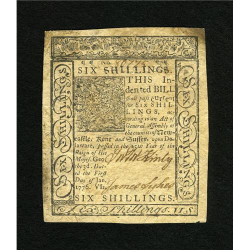 <B>Delaware January 1, 1776 6s About New.</B></I> Four jumbo margins are found on this crisp and well printed Delaware note. Minor corner handling is all that keeps the New grade from being attained.<BR><BR><b>Shipping:</b> Coins & Currency (<a target="_blank" href="http://www.heritageauctions.com/common/shipping.php">view shipping information</a>)