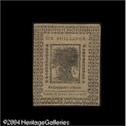 Delaware January 1, 1776 6s Choice New. Closely mar <B>Delaware January 1, 1776 6s Choice New.</B></I> Closely margined all around, but well signed and strictly uncirculated. <BR><BR><B>Important notice:</B> Heritage usually auctions material at the rate of 200-250 lots per hour. On some occasions eBay Live bid software or the Internet may not be able to keep up with the pace of the auction. We recommend placing a realistic absentee bid now as insurance to avoid disappointment. Occasionally the auctioneer may eliminate or reject an eBay Live bid, and the auctioneer may also reopen a lot after the close of the eBay live bidding (usually because we missed an audience bid), and may reject your bid even if it shows you as the winning bidder. By bidding via eBay Live, you agree that Heritage may award the lot to another bidder at its sole discretion under the circumstances described above or any other reasonable circumstances. Since eBay bids are not shown to us until we open the lot on the floor, we treat those bids just like floor bids. In most cases the floor responds before the eBay bid is presented to us, due to Internet lag time, so for consistency we have made it a policy that floor bids are always considered first over tie eBay live bids. Also please note that all Heritage lots purchased through eBay Live carry a 20% Buyer's Premium. Please make sure you read the Terms and Conditions before you bid. This lot is being auctioned in conjunction with a live floor auction by Heritage Galleries & Auctioneers. All final auction and invoice information will be supplied by Heritage Galleries & Auctioneers, and all other information should be considered preliminary. Lot:15111