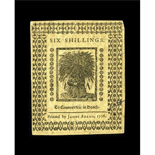 <B>Delaware January 1, 1776 6s Choice New.</B></I> Most graders would claim that this note is a gem with its robust print quality, bold signatures and superior embossing. The top left touching the corner precludes the gem grade in this cataloger's mind but is likely someone will disagree and pursue it as a Gem.<BR><BR><b>Shipping:</b> Coin/Currency (<a target="_blank" href="http://www.heritageauctions.com/common/shipping.php">view shipping information</a>)