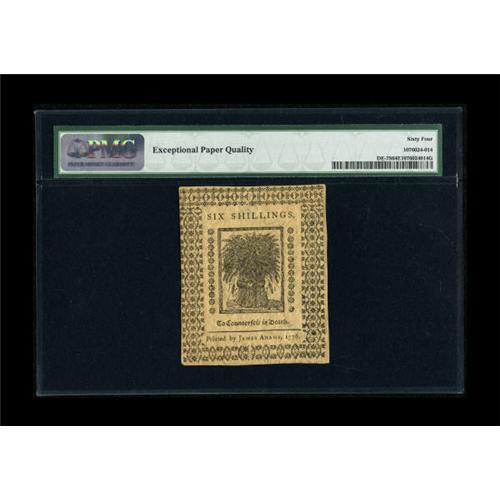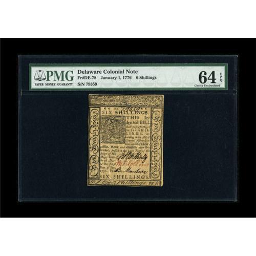 <B>Delaware January 1, 1776 6s PMG Choice Uncirculated 64 EPQ.</B></I> Exceptionally bold signatures and serial number are noted on this near-Gem issue. The printing is as deep as one will find and the paper is refreshingly original.<BR><BR><b>Shipping:</b> Coins & Currency (<a target="_blank" href="http://www.heritageauctions.com/common/shipping.php">view shipping information</a>)