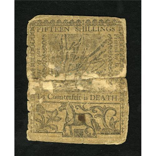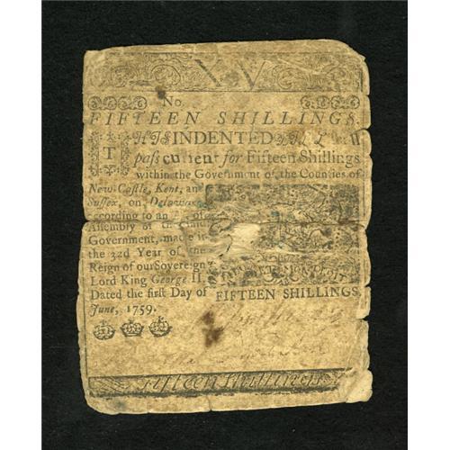 <B>Delaware June 1, 1759 15s Very Good.</B></I> A host of minor problems are found on this desirable Ben Franklin note.<BR><BR><b>Shipping:</b> Coins & Currency (<a target="_blank" href="http://www.heritageauctions.com/common/shipping.php">view shipping information</a>)