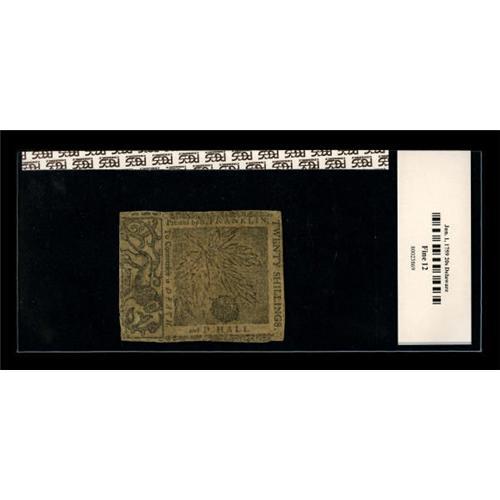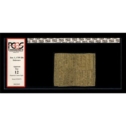 <B>Delaware June 1, 1759 20s PCGS Apparent Fine 12.</B></I> Ben Franklin printed this note that had a run of only 7,750 pieces. The "repaired center split" was very well executed.<BR><BR><b>Shipping:</b> Coins & Currency (<a target="_blank" href="http://www.heritageauctions.com/common/shipping.php">view shipping information</a>)