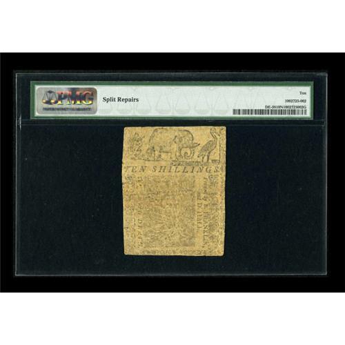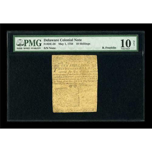<B>Delaware May 1, 1758 10s PMG Very Good 10 Net.</B></I> The "Printed by B. Franklin" on the back is clear, as is most of the text on both sides. The signatures and serial number have faded. Some "split repairs" have been noted, thus the net grade. This is a fairly typical example of this rare issue and the first we have been able to offer at Heritage, which is not surprising since only £8000 in all denominations were issued.<BR><BR><b>Shipping:</b> Coins & Currency (<a target="_blank" href="http://www.heritageauctions.com/common/shipping.php">view shipping information</a>)