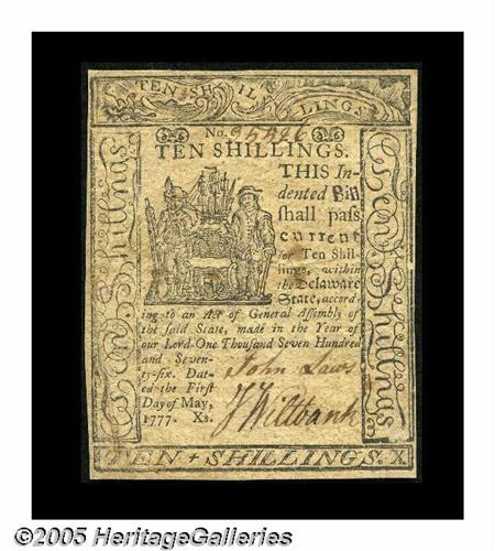 <B>Delaware May 1, 1777 10s Extremely Fine-About New.</B></I> Really nice looking from the face with a few minor stains on the back.