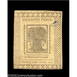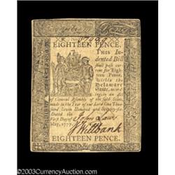 <TABLE cellSpacing=0 cellPadding=0 width="100%" bgColor=#000000 border=0><TBODY> <TR><TD width="100%"><TABLE cellSpacing=1 cellPadding=3 width="100%" border=0><TBODY><TR><TD width="100%" bgColor=#79735c><FONT face=arial color=#ffffff size=3><B>Description</B> </FONT></TD></TR><TR><TD width="100%" bgColor=#ffffff><FONT face=arial size=2><B>Delaware May 1, 1777 18d Choice About New.</B></I> An ideal example for the grade, separated from Choice New by a light horizontal fold only. (400-up ) </FONT></TD></TR></TBODY></TABLE></TD></TR></TBODY></TABLE><BR><TABLE cellSpacing=0 cellPadding=0 width="100%" bgColor=#000000 border=0><TBODY><TR> Important notice: Heritage usually auctions material at the rate of 200-250 lots per hour. On some occasions eBay Live bid software or the Internet may not be able to keep up with the pace of the auction. We recommend placing a realistic absentee bid now as insurance to avoid disappointment. Occasionally the auctioneer may eliminate or reject an eBay Live bid, and the auctioneer may also reopen a lot after the close of the eBay live bidding (usually because we missed an audience bid), and may reject your bid even if it shows you as the winning bidder. By bidding via eBay Live, you agree that Heritage may award the lot to another bidder at its sole discretion under the circumstances described above or any other reasonable circumstances. Also please note that all Heritage lots purchased through eBay Live carry a 20% Buyer's Premium. Please make sure you read the Terms and Conditions before you bid.</TR></TBODY></TABLE>