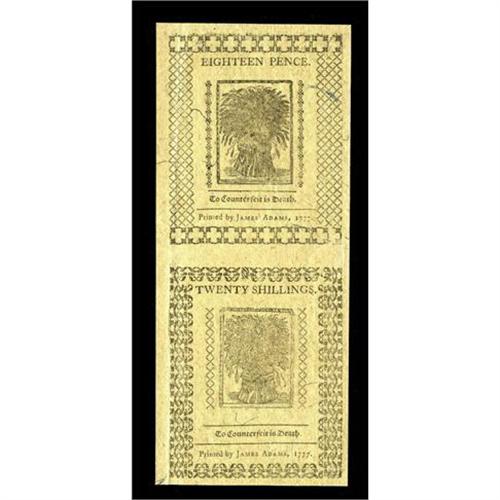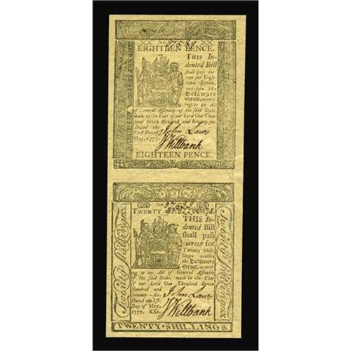<B>Delaware May 1, 1777 18d and 20s Vertical Pair Choice About New.</B></I> An unsevered pair from this much more difficult issue. There is a sheet fold near the right edge of both notes, but they are otherwise Superb, with perfect color, strong signatures, broad margins and no problems of any kind.
