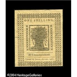 Delaware May 1, 1777 1s Very Fine. The lower left corne <B>Delaware May 1, 1777 1s Superb Gem New.</B></I> This is from the far scarcer Delaware issue, and it's a denomination that is not often seen. We have sold only three examples. This broadly margined, boldly signed, perfect piece should easily pass the four-figure mark. <BR><BR><B>Important notice:</B> Heritage usually auctions material at the rate of 200-250 lots per hour. On some occasions eBay Live bid software or the Internet may not be able to keep up with the pace of the auction. We recommend placing a realistic absentee bid now as insurance to avoid disappointment. Occasionally the auctioneer may eliminate or reject an eBay Live bid, and the auctioneer may also reopen a lot after the close of the eBay live bidding (usually because we missed an audience bid), and may reject your bid even if it shows you as the winning bidder. By bidding via eBay Live, you agree that Heritage may award the lot to another bidder at its sole discretion under the circumstances described above or any other reasonable circumstances. Since eBay bids are not shown to us until we open the lot on the floor, we treat those bids just like floor bids. In most cases the floor responds before the eBay bid is presented to us, due to Internet lag time, so for consistency we have made it a policy that floor bids are always considered first over tie eBay live bids. Also please note that all Heritage lots purchased through eBay Live carry a 20% Buyer's Premium. Please make sure you read the Terms and Conditions before you bid. This lot is being auctioned in conjunction with a live floor auction by Heritage Galleries & Auctioneers. All final auction and invoice information will be supplied by Heritage Galleries & Auctioneers, and all other information should be considered preliminary. Lot:15114
