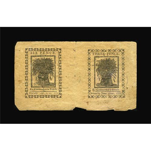 <B>Delaware May 1, 1777 3d & 6d Uncut Pair About New.</B></I> A couple of corners are missing on this widely margined pair. Tough as individual pieces, but desirable as a pair. <BR><BR><b>Shipping:</b> Coins & Currency (<a target="_blank" href="http://www.heritageauctions.com/common/shipping.php">view shipping information</a>)