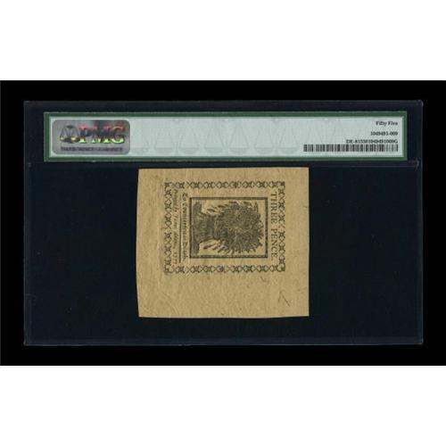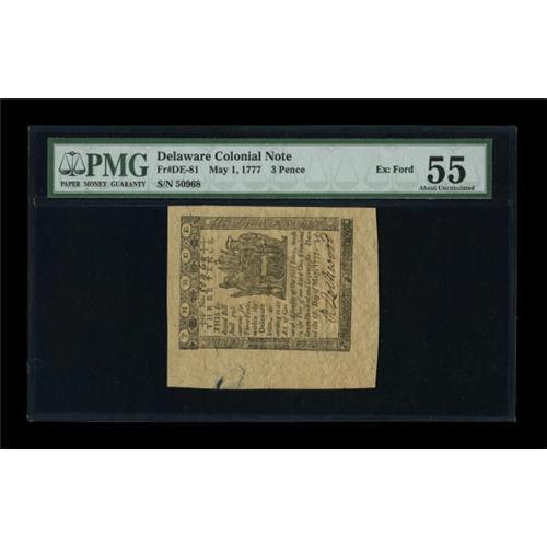 <B>Delaware May 1, 1777 3d PMG About Uncirculated 55.</B></I> This note is from the much scarcer 1777 issue and has been blessed with gargantuan margins and superb print quality. But for a small cornerfold in the lower left corner this example would easily garner some type of gem grade. If you are waiting for this note to sell for typical AU money then you better be prepared to wait for a long time.<BR><BR><b>Shipping:</b> Coins & Currency (<a target="_blank" href="http://www.heritageauctions.com/common/shipping.php">view shipping information</a>)