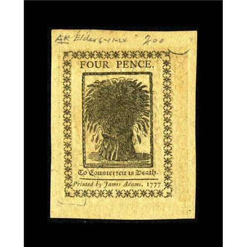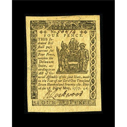 <B>Delaware May 1, 1777 4d Gem New.</B></I> A truly desirable example is this scarcer 1777 issue in this state of preservation. There are four abundant margins with bold signature and superb print quality. Fully punched through embossing is easily seen on the back as well. A nice piece of history as there is a very old dealer pencil notation "AK Elder 6-11-24 200." This note came from John Haseltine so this inscription almost certainly signifies that it was sold to famed numismatist Thomas Lee Elder on June 11, 1924 for the then princely sum of $2.00. How times have changed as our estimate is five hundred times that amount.<BR><BR><b>Shipping:</b> Coin/Currency (<a target="_blank" href="http://www.heritageauctions.com/common/shipping.php">view shipping information</a>)
