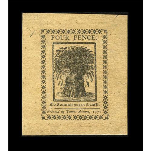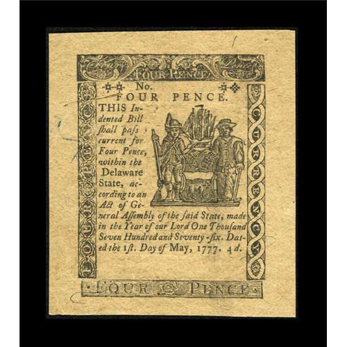 <B>Delaware May 1, 1777 4d Choice About New.</B></I> A sheet fold is noticed near the bottom of this otherwise pristine note that is hugely margined. This Small Change note from a scarcer Delaware issue had a printing of only 5,454 notes.<BR><BR><b>Shipping:</b> Coins & Currency (<a target="_blank" href="http://www.heritageauctions.com/common/shipping.php">view shipping information</a>)