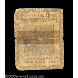 <TABLE cellSpacing=0 cellPadding=0 width="100%" bgColor=#000000 border=0><TBODY> <TR><TD width="100%"><TABLE cellSpacing=1 cellPadding=3 width="100%" border=0><TBODY><TR><TD width="100%" bgColor=#79735c><FONT face=arial color=#ffffff size=3><B>Description</B> </FONT></TD></TR><TR><TD width="100%" bgColor=#ffffff><FONT face=arial size=2><B>Delaware May 31, 1760 20s Fine.</B></I> A two-color note that has the majority of the red printing still distinct. The corners are rounded and the center fold has been tape repaired on the back. The overall appearance of this note is considerably better than what is normally seen, and the B. Franklin imprint is clear. (300-up ) </FONT></TD></TR></TBODY></TABLE></TD></TR></TBODY></TABLE><BR><TABLE cellSpacing=0 cellPadding=0 width="100%" bgColor=#000000 border=0><TBODY><TR> Important notice: Heritage usually auctions material at the rate of 200-250 lots per hour. On some occasions eBay Live bid software or the Internet may not be able to keep up with the pace of the auction. We recommend placing a realistic absentee bid now as insurance to avoid disappointment. Occasionally the auctioneer may eliminate or reject an eBay Live bid, and the auctioneer may also reopen a lot after the close of the eBay live bidding (usually because we missed an audience bid), and may reject your bid even if it shows you as the winning bidder. By bidding via eBay Live, you agree that Heritage may award the lot to another bidder at its sole discretion under the circumstances described above or any other reasonable circumstances. Also please note that all Heritage lots purchased through eBay Live carry a 20% Buyer's Premium. Please make sure you read the Terms and Conditions before you bid.</TR></TBODY></TABLE>