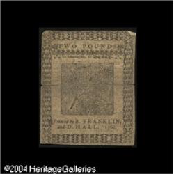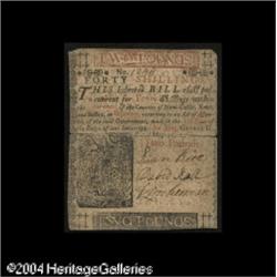 Delaware May 31, 1760 40s Choice Very Fine. This specta <B>Delaware May 31, 1760 40s Choice Very Fine.</B></I> This spectacular note from this rare issue has perfect signatures, bright colors, no repairs of any kind, and no problems save for slightly rounded corners and short splits at either end of the horizontal centerfold. The "D" in L2 is backwards at both the top and bottom of the face. A great note and the finest we've handled in this denomination. <BR><BR><B>Important notice:</B> Heritage usually auctions material at the rate of 200-250 lots per hour. On some occasions eBay Live bid software or the Internet may not be able to keep up with the pace of the auction. We recommend placing a realistic absentee bid now as insurance to avoid disappointment. Occasionally the auctioneer may eliminate or reject an eBay Live bid, and the auctioneer may also reopen a lot after the close of the eBay live bidding (usually because we missed an audience bid), and may reject your bid even if it shows you as the winning bidder. By bidding via eBay Live, you agree that Heritage may award the lot to another bidder at its sole discretion under the circumstances described above or any other reasonable circumstances. Since eBay bids are not shown to us until we open the lot on the floor, we treat those bids just like floor bids. In most cases the floor responds before the eBay bid is presented to us, due to Internet lag time, so for consistency we have made it a policy that floor bids are always considered first over tie eBay live bids. Also please note that all Heritage lots purchased through eBay Live carry a 20% Buyer's Premium. Please make sure you read the Terms and Conditions before you bid. This lot is being auctioned in conjunction with a live floor auction by Heritage Galleries & Auctioneers. All final auction and invoice information will be supplied by Heritage Galleries & Auctioneers, and all other information should be considered preliminary. Lot:15099