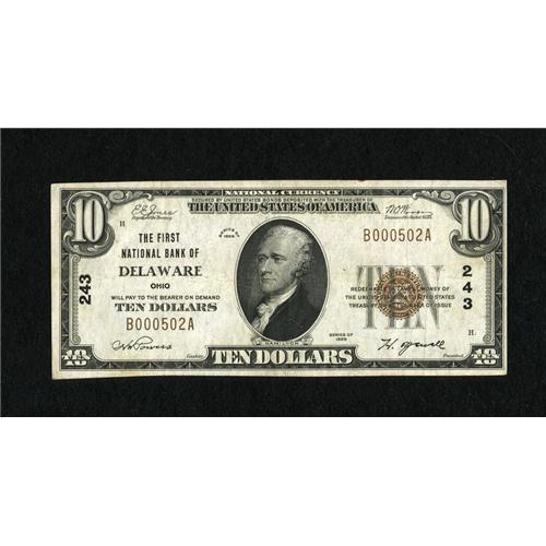 <B>Delaware, OH</B></I> - $10 1929 Ty. 1 <B>The First NB</B></I> Ch. # 243<BR>Start exploring the possibility of collecting "two state" notes like this Ohio note from the town of Delaware. H.W. Powers and H.W. Jewell were able to guide this bank through the Great Depression. <B>Very Fine.</B></I><BR><BR><b>Shipping:</b> Coin/Currency (<a target="_blank" href="http://www.heritageauctions.com/common/shipping.php">view shipping information</a>)