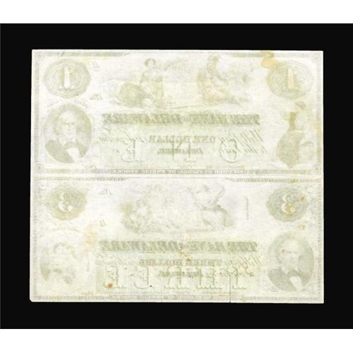 <B>Delaware, OH- Bank of Delaware</B></I> $1-$3 18__ G2b-G4b Wolka 101902-101905 Uncut Sheet<BR>We have handled a note on this rare bank only once before. These notes with the green tint are listed in Haxby and Wolka as proof only. There is a fold between the notes plus other handling. The bottom note has been cut cancelled along the bottom edge with four approximate half inch slits, with one slit giving birth to an additional one inch tear. The upper left-hand corner reveals a small moisture spot, while the bottom note exhibits some light foxing. A couple of pinholes and a small top edge tear round out the description. The portrait is of Governor Salmon P. Chase. <B>Extremely Fine-About Uncirculated.</B></I>