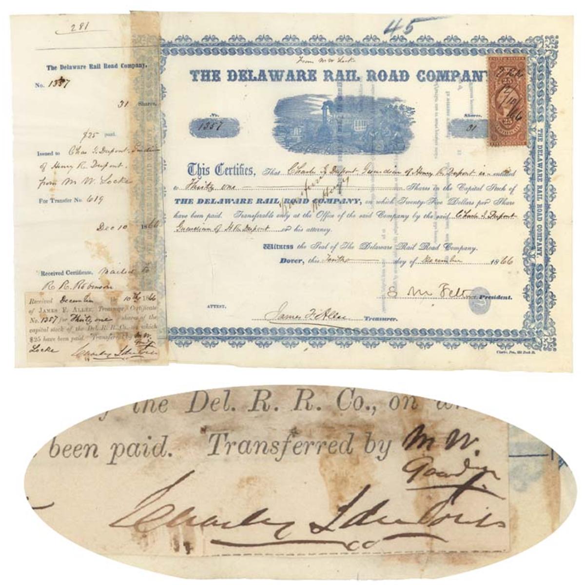 1866, Delaware. Stock certificate for 31 shares. Blue on white paper with attached adhesive revenue stamp. Train vignette at top center. Issued to Charles I. Dupont as guardian of Henry R. Dupont and signed at lower left as the recipient of the certificate by Charles I. Dupont (d. 1902). Business Executive. Active in the powder portion of the business and in the development of smokeless gunpowder, Charles served for many years as secretary/treasurer of DuPont. Glue residue at stub. Very fine. Cut cancelled at company seal, all paper intact.