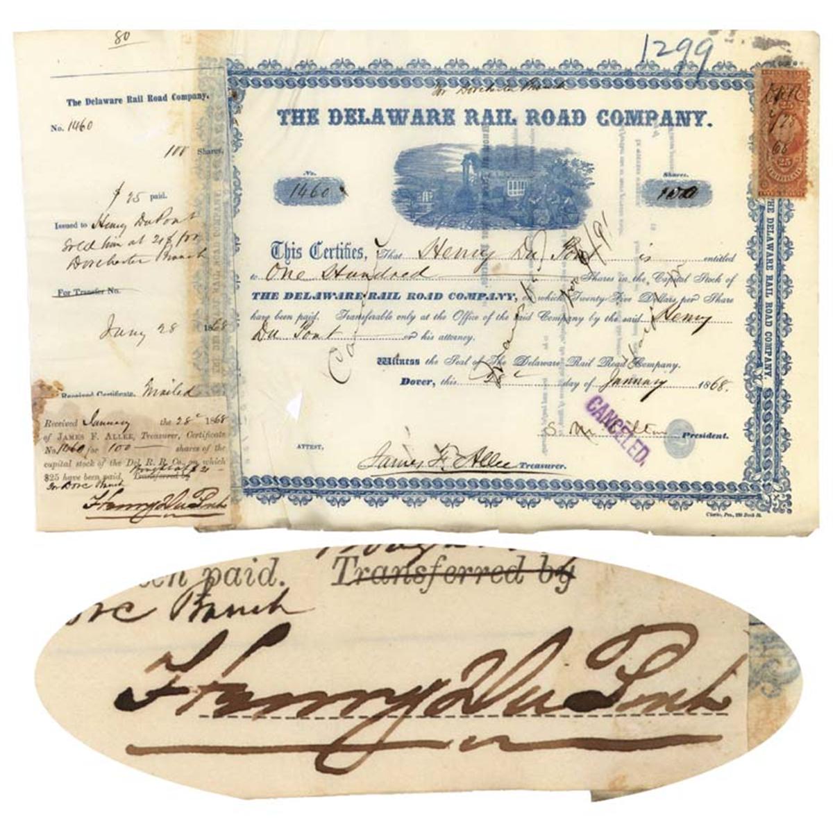 1868, Delaware. Stock certificate for 100 shares. Blue with attached adhesive revenue at top right. Vignette of a train travelling through the countryside. Issued to and signed on the stub by Henry DuPont (1812-1889). Manufacturer. The second son of E. I. duPont, he ran the family firm following his brother Alfred. During the Civil War he was an ardent supporter of the North, providing its army with gunpowder at below market prices. Glue residue at stub, some bleed through from ink on verso and rough bottom margin. Very Good. Stamp, pen and cut cancelled, DuPont's signature is unaffected.