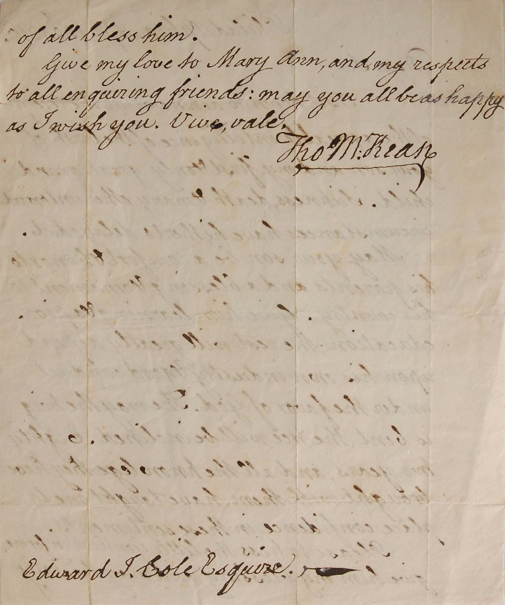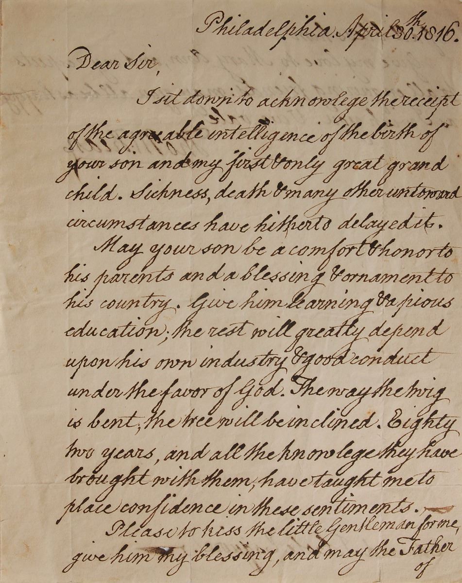 Influential Delaware politician (1734–1817) who signed the Declaration of Independence and the Articles of Confederation. ALS signed “Tho M:Kean,” one page both sides, 7.75 x 10, April 30, 1816. Letter to Edward J. Coale, in full: “I sit down to acknowledge the receipt of the agreeable intelligence of the birth of your son, and my first and only great grandchild. Sickness, death, and many other untoward circumstances have hitherto delayed it. May your son be a comfort and an honor to his parents and a blessing & ornament to his country. Give him learning, and a pious education; the rest will greatly depend upon his own industry and good conduct, under the favor of God. The way the twig is bent, the tree will be inclined. Eighty-two years and all the knowledge they have brought with them, have taught me to put confidence in these sentiments. Please do kiss the little gentleman for me, give him my blessing, and may the Father of all bless him. Give my love to Mary Ann, and my respects to all enquiring friends: May you all be as happy as I wish you. Vive, vale.” Includes the original clipped address leaf, addressed in McKean’s own hand. In fine condition, with writing showing through from opposing sides, and one small area of ink erosion near the bottom edge.