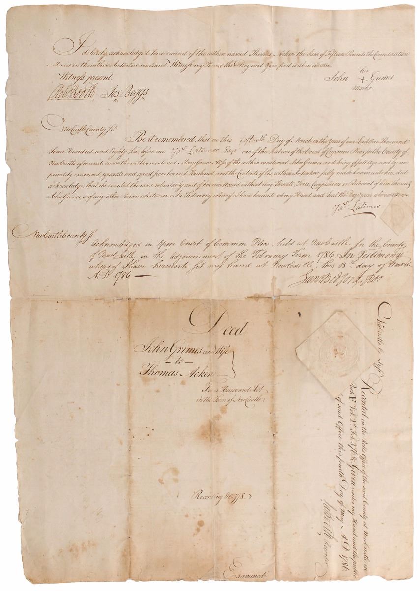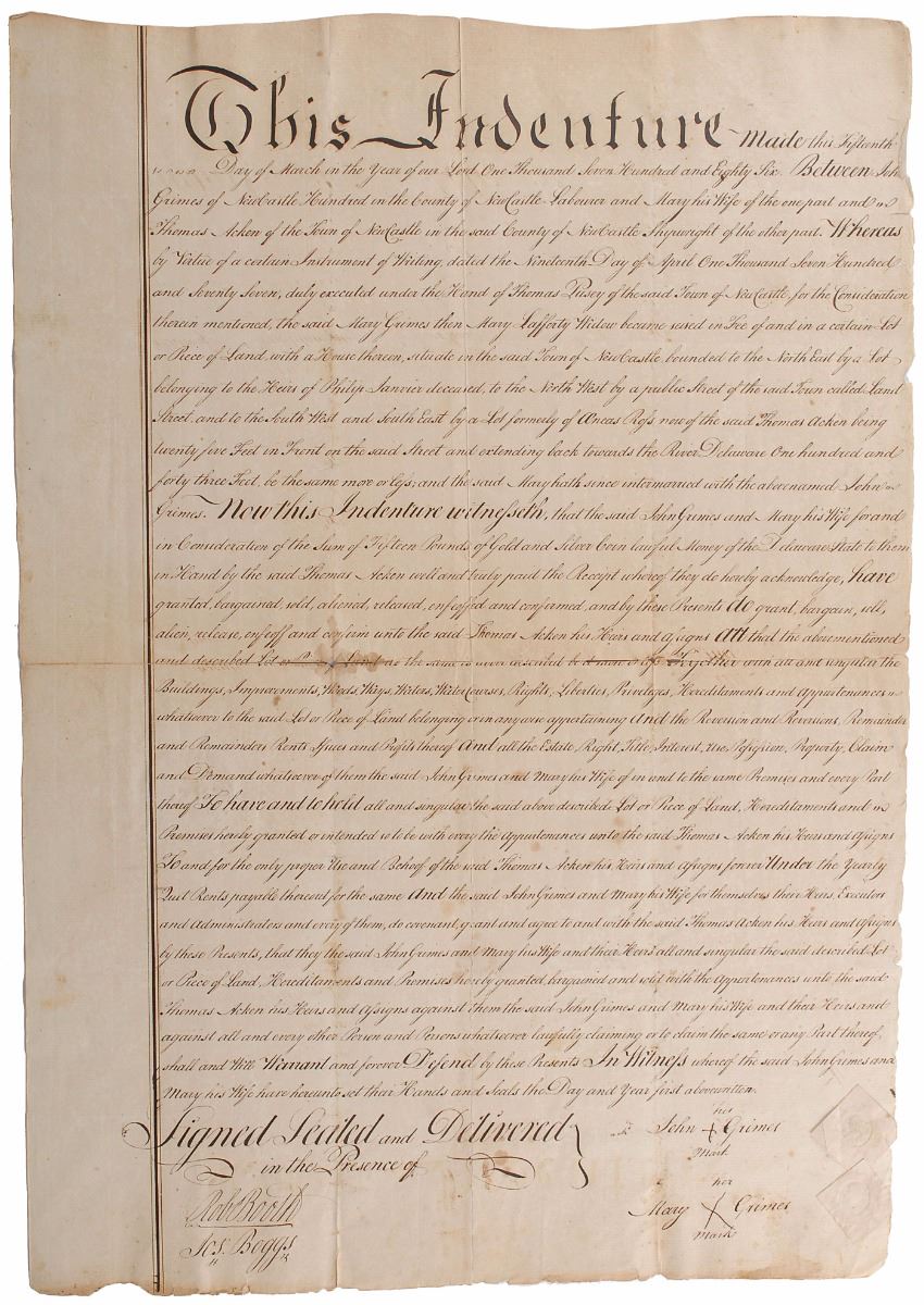 Manuscript document, one page, 15 x 21, March 15, 1786. Indenture by which John and Mary Grimes of New Castle, Delaware, sell a “Piece of Land, with a House thereon, situate on the said Town of New Castle” in exchange for “the Sum of Fifteen Pounds of Gold and Silver Coin lawful Money of the Delaware State.” Signed at the conclusion by John Grimes and Mary Grimes with their marks. In very good condition, with repaired separations to folds.