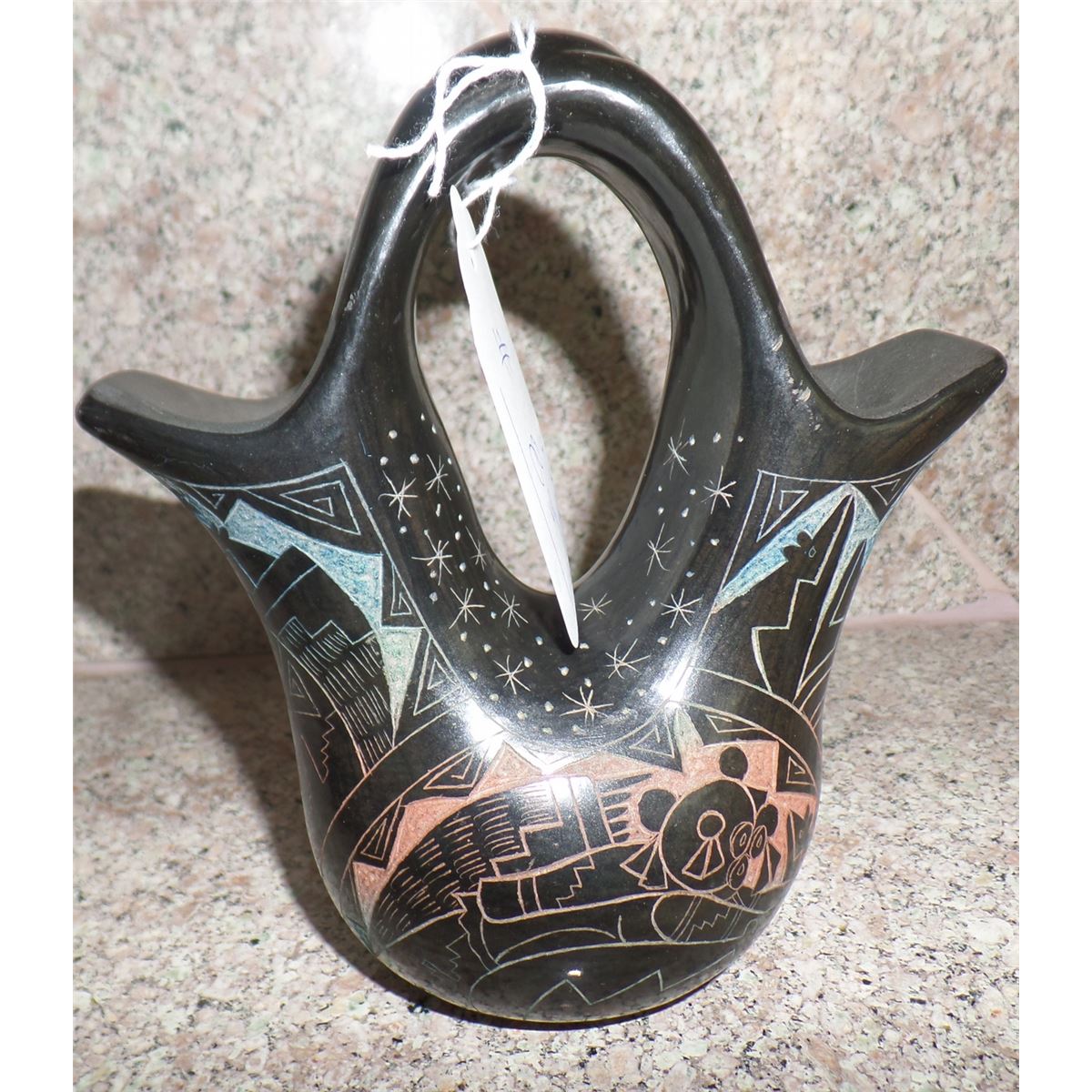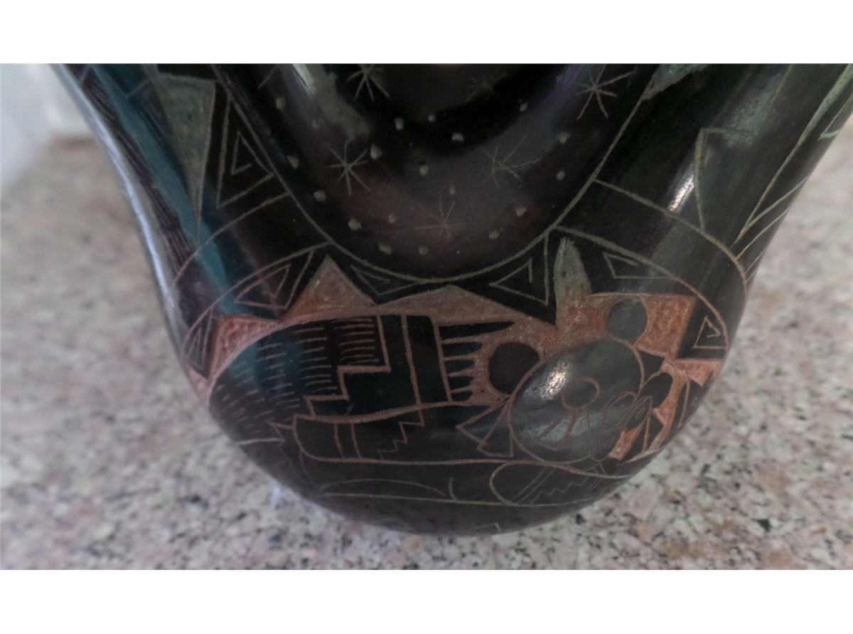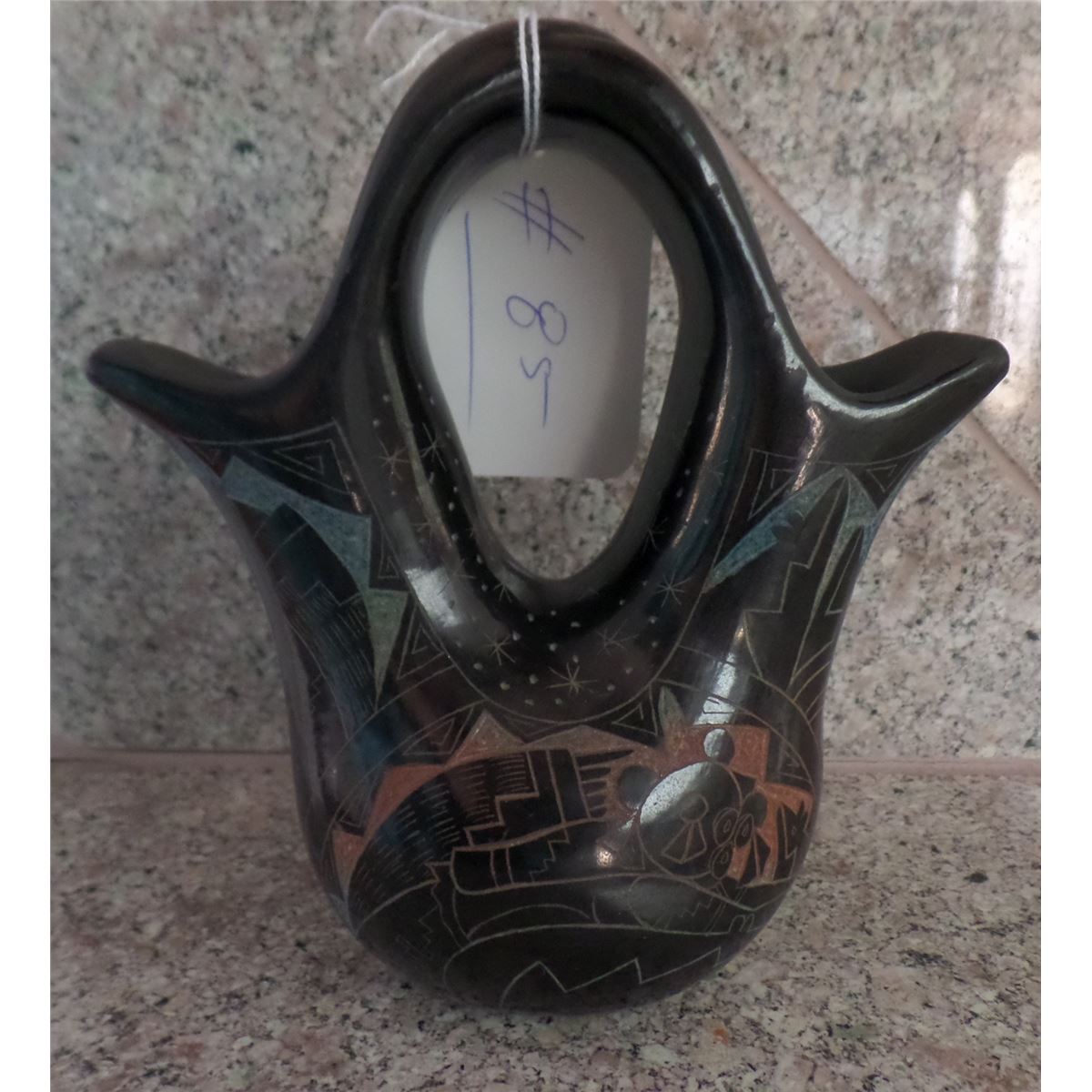 Rare Hopi Wedding pottery item from the 196 0's. This clay and paint item measures 6 1/2 x 6 x 3 inches and is from Northern, Arizona. It is in good condition with carvings of bears covering the pot. This is signed Delawepi, New Mexico. Shipping $20.00 must be double wrapped