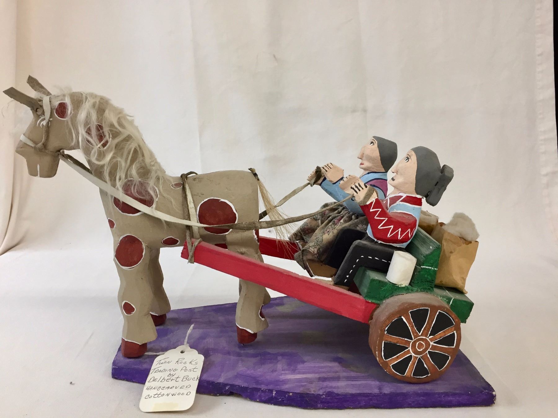Description: Hand carved cottonwood Navajo folk art. Maker: Delbert Buck. Approx. Age: Vintage. Size: 15” l x 10 1/2” tall. Condition: Good for its age, normal wear expected. Please look closely at the pictures - they are an important part of our description. Shipping: There will be a $10 handling / packaging fee for shipping this lot. The actual cost of postage will be added on top of that.