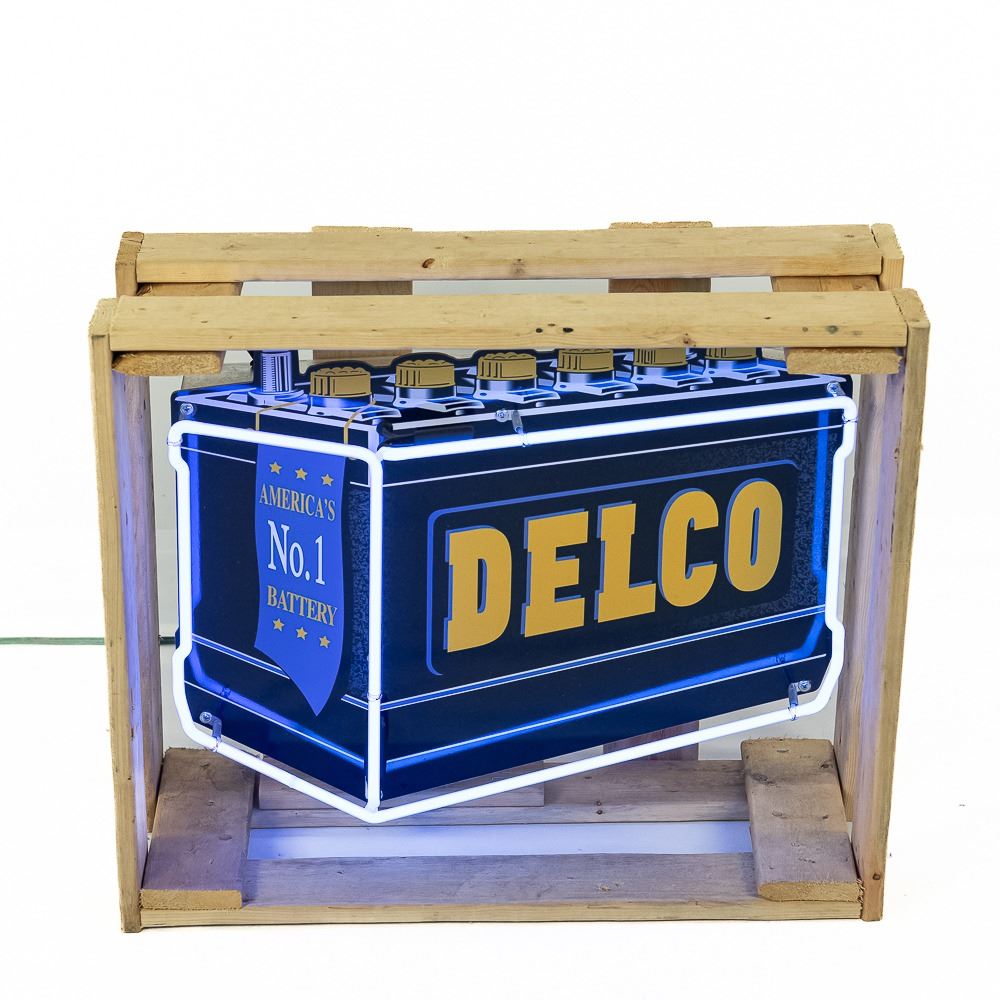 Captivating die cut contemporary Delco batteries neon advertising sign. Presents extremely well with bold eye catching color and working neon, in very good overall condition. Approximately 18"t x 9"d x 22"l, perfect addition to your collection, please use photos to judge condition and bid accordingly.