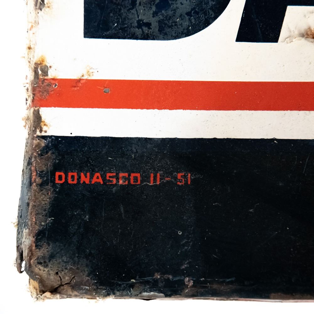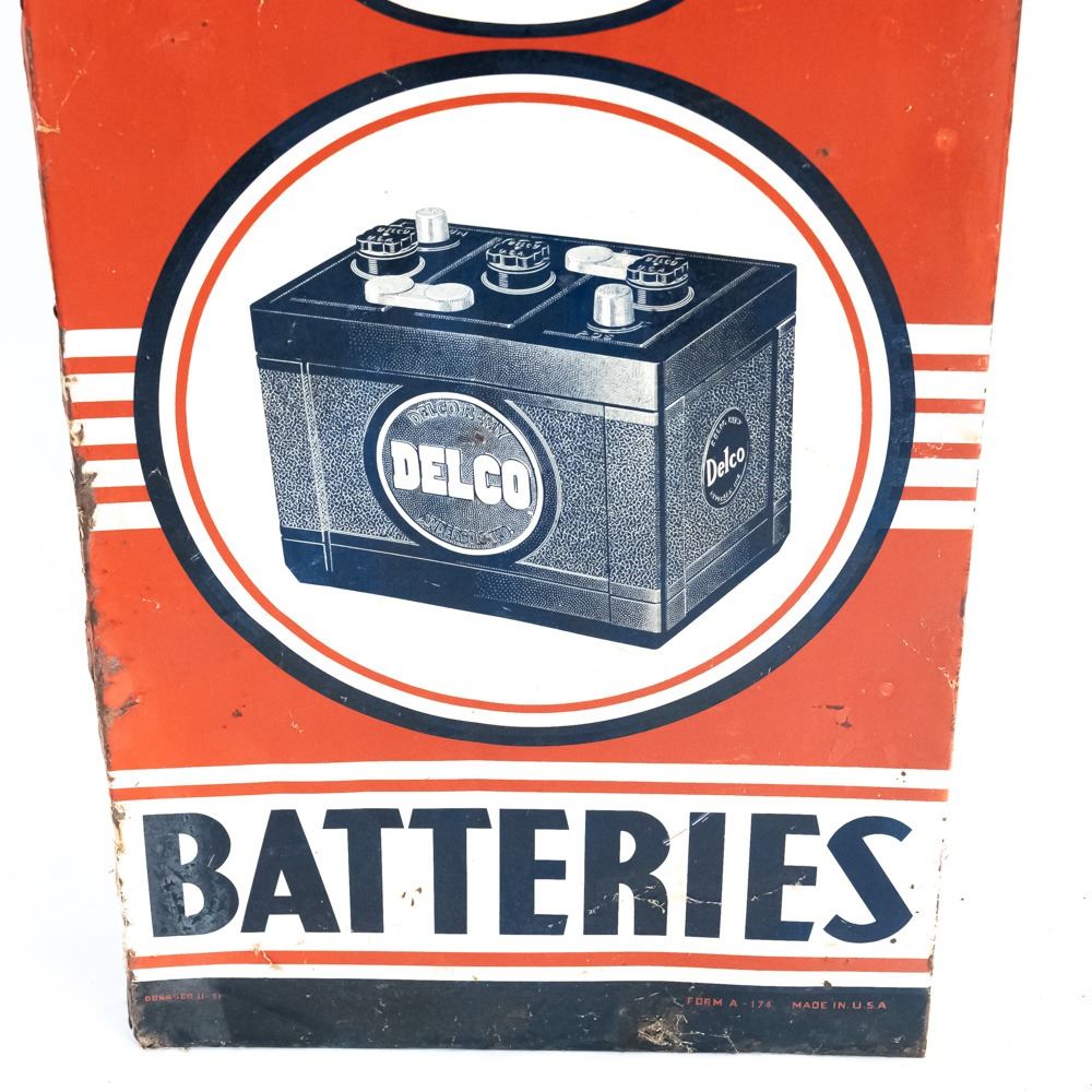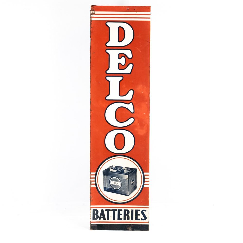1951 "Delco Batteries" single sided tin advertising sign. Self framed with wood framing. "DONASCO 11-51 & FORM A-174 Made in USA" stamped near bottom edges. Good to very good overall condition with some discoloration, dings, scratches, stray marks, extra holes & oxidation rust (2 corners show gaps). Approximately 70.5"t x 18.5"l. Please use photos to judge condition and bid accordingly.