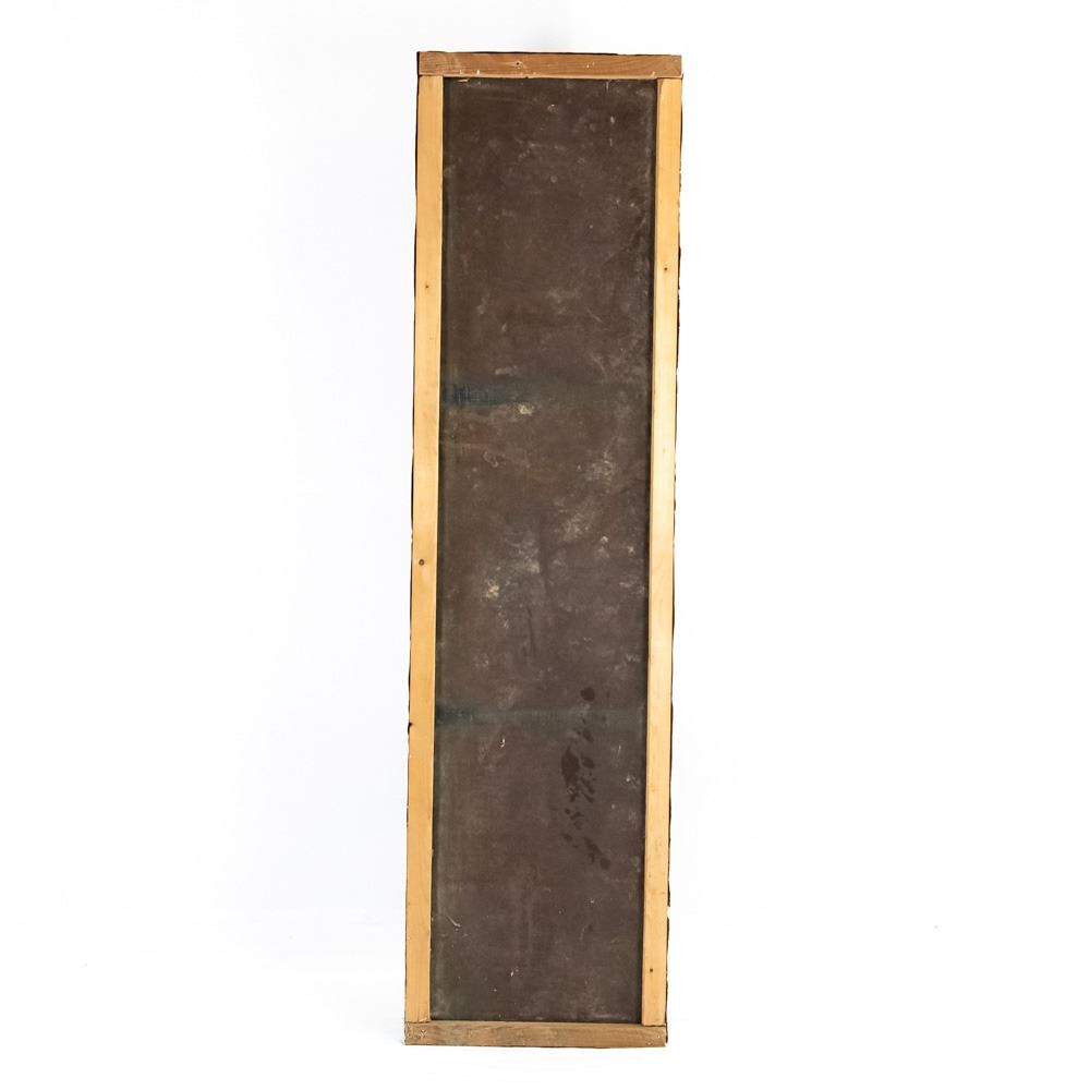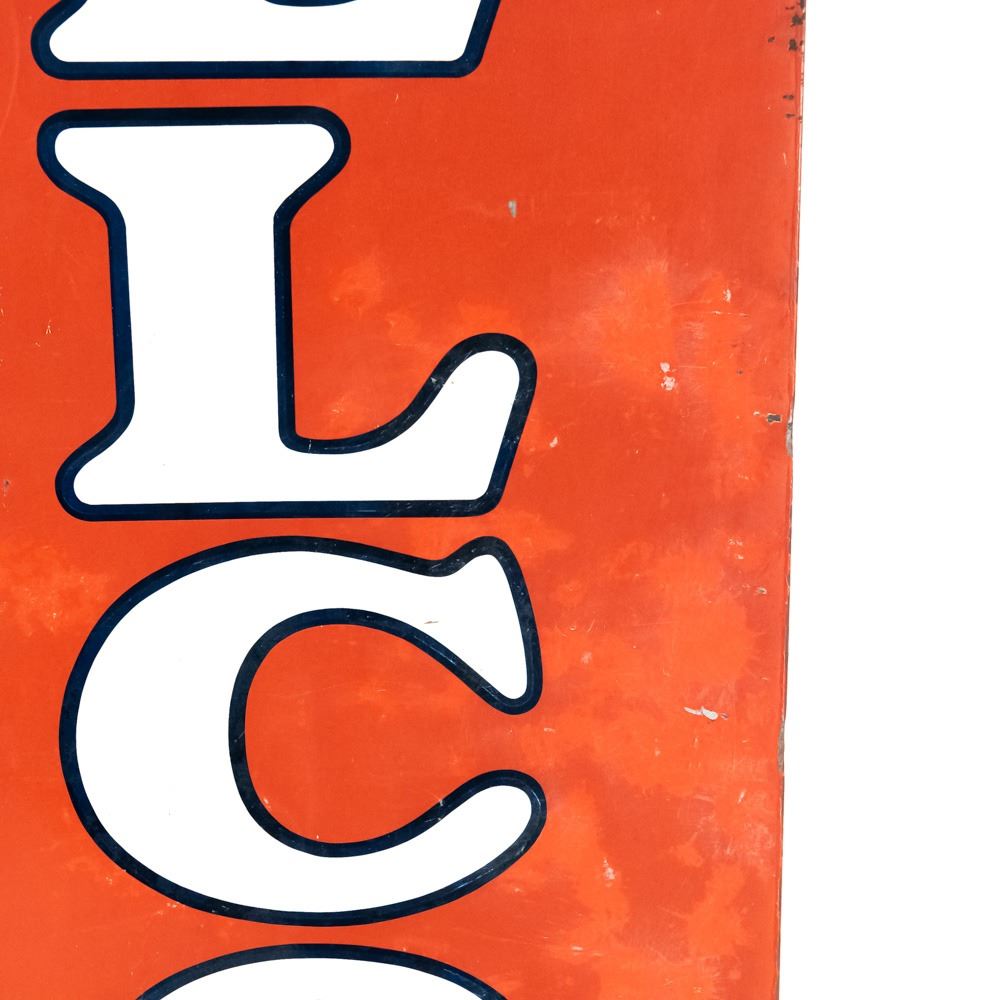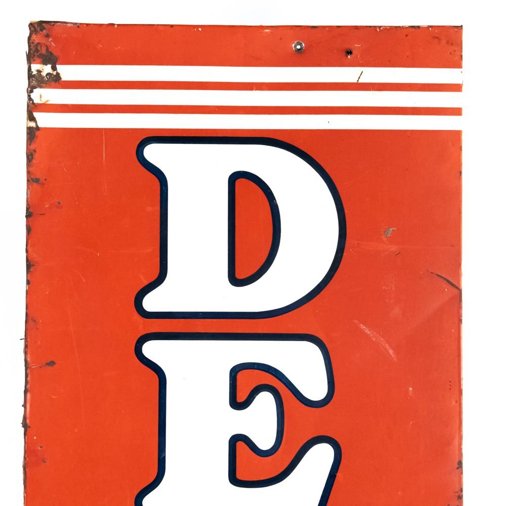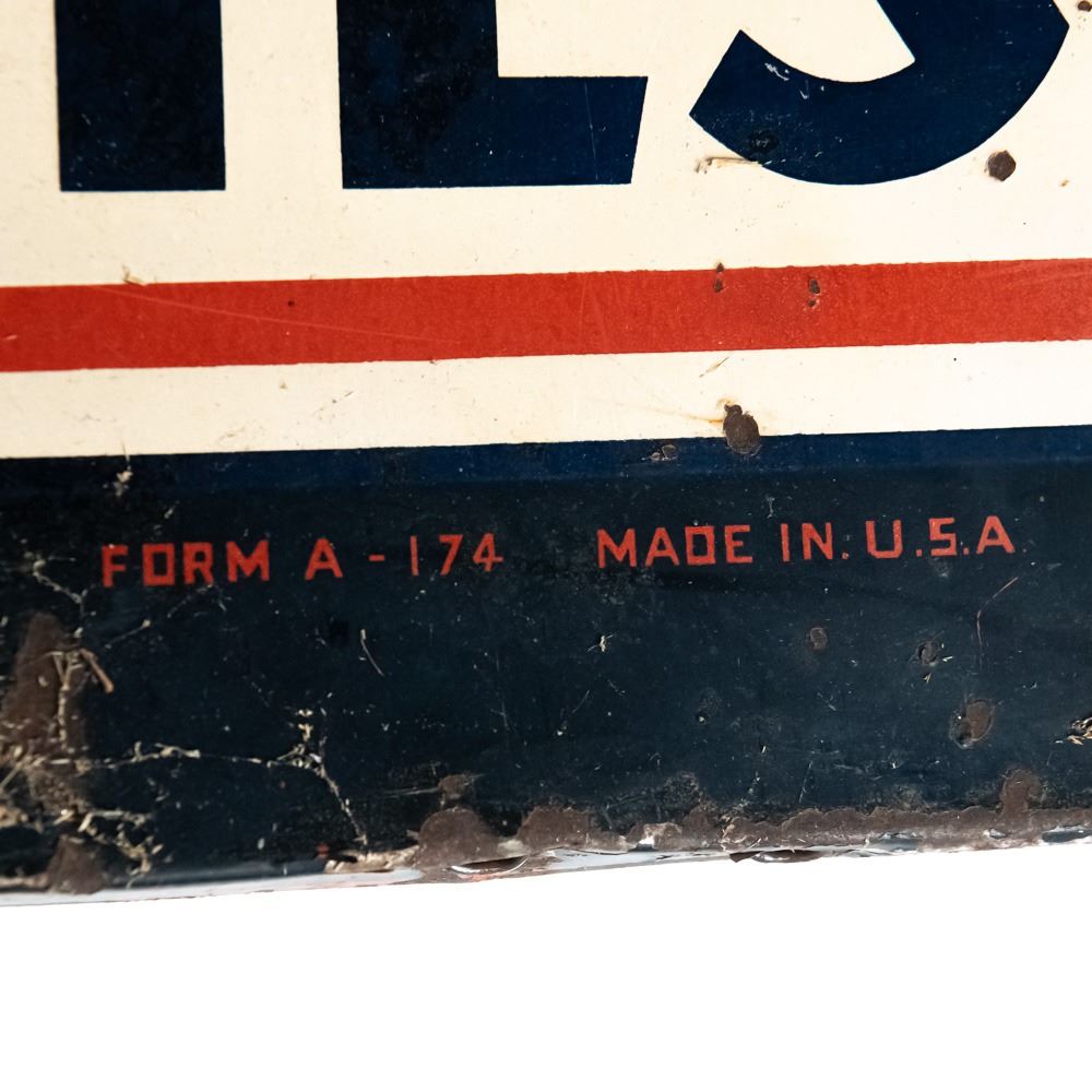 1951 "Delco Batteries" single sided tin advertising sign. Self framed with wood framing. "DONASCO 11-51 & FORM A-174 Made in USA" stamped near bottom edges. Good to very good overall condition with some discoloration, dings, scratches, stray marks, extra holes & oxidation rust (2 corners show gaps). Approximately 70.5"t x 18.5"l. Please use photos to judge condition and bid accordingly.