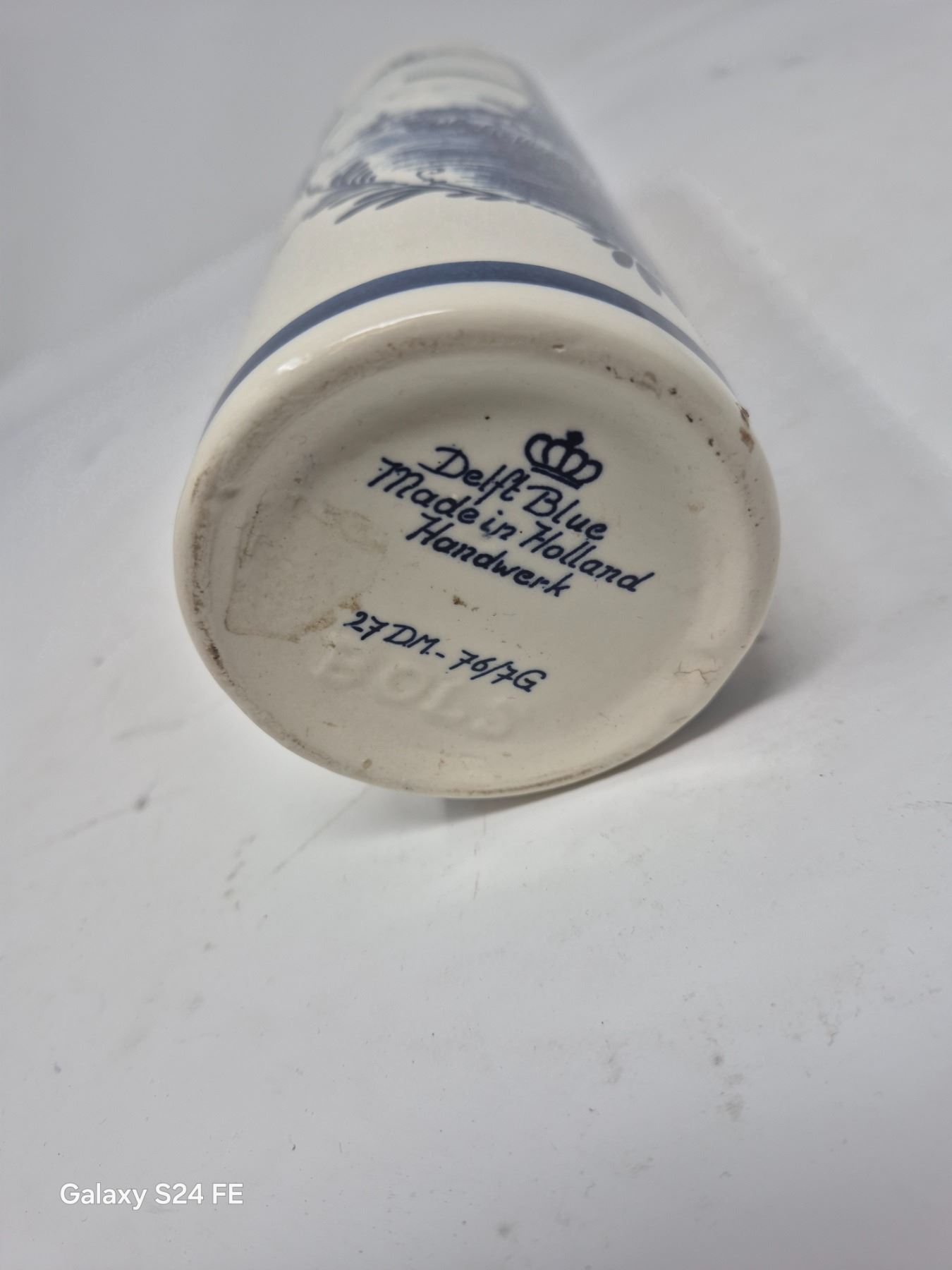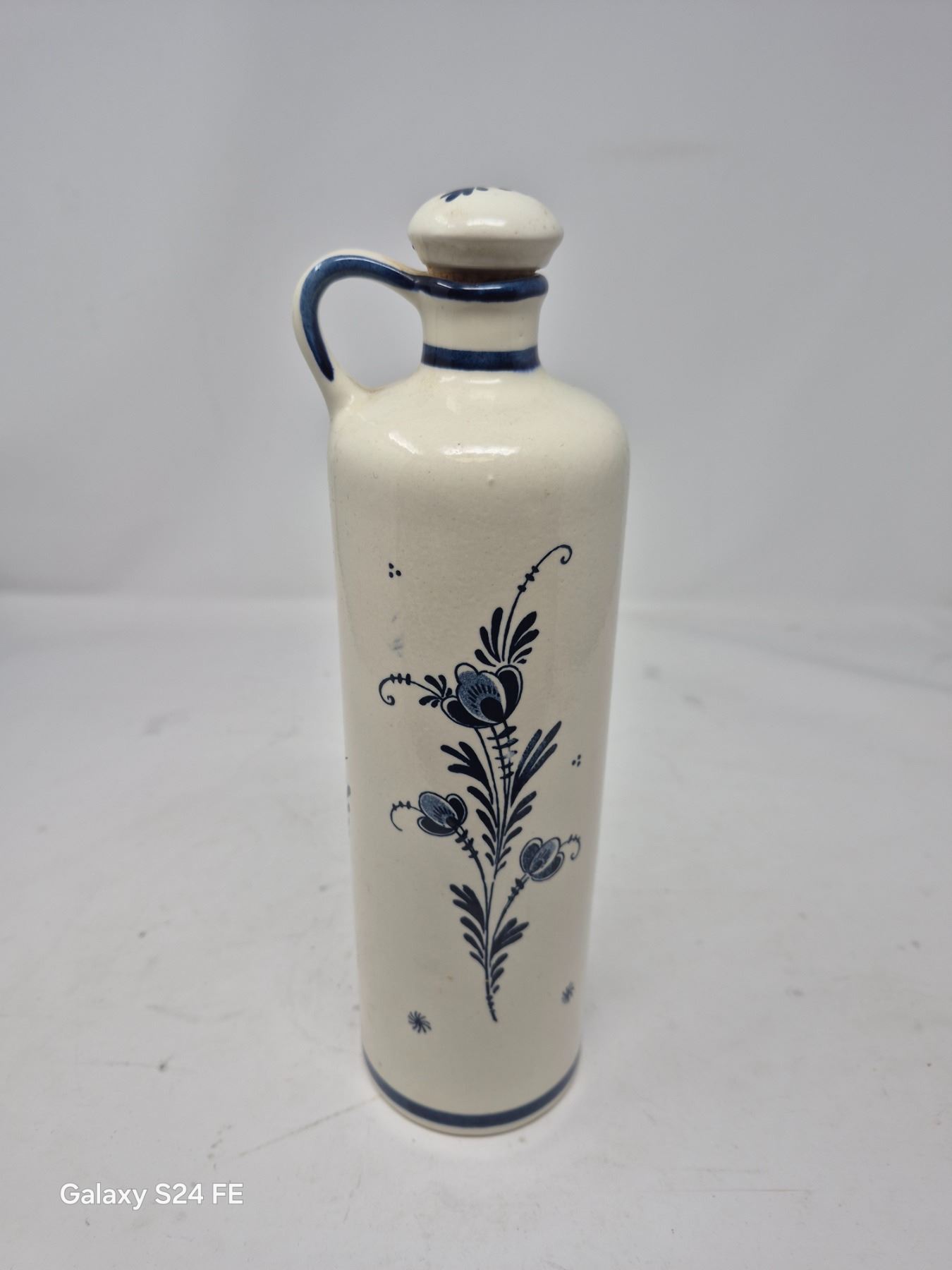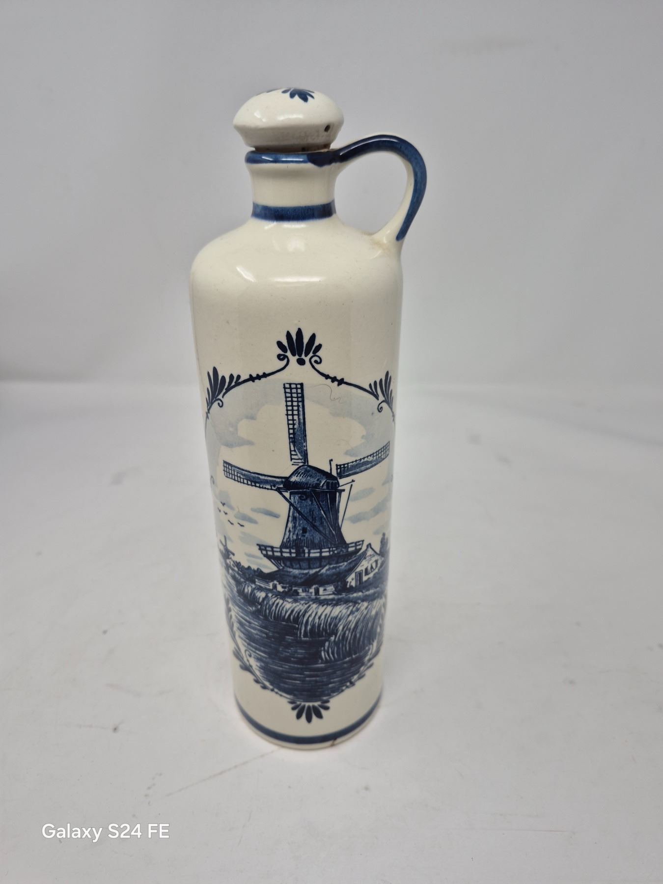 Hand-painted Dutch ceramic liquor bottle with windmill scene. Marked “Delft Blue Made in Holland Handwerk” and numbered “27 DM-747G” on base. Includes matching stopper.