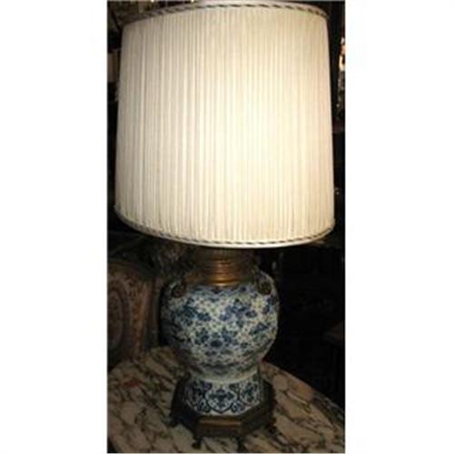 Ancient and beautiful. A c1770s Delft vase converted to a lamp in c1820s. French bronze work. Octagonal base.