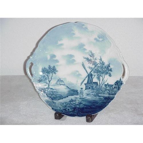 A blue and white delft plate, 10 3/4" in diameter, 12" across at handles. The scene of a Dutch girl walking in the foreground with a windmill on the waters edge. A classic delft color, the plate was made by Philip Rosenthal & co. in Germany. Condition is very good, no chips or cracks. (2)