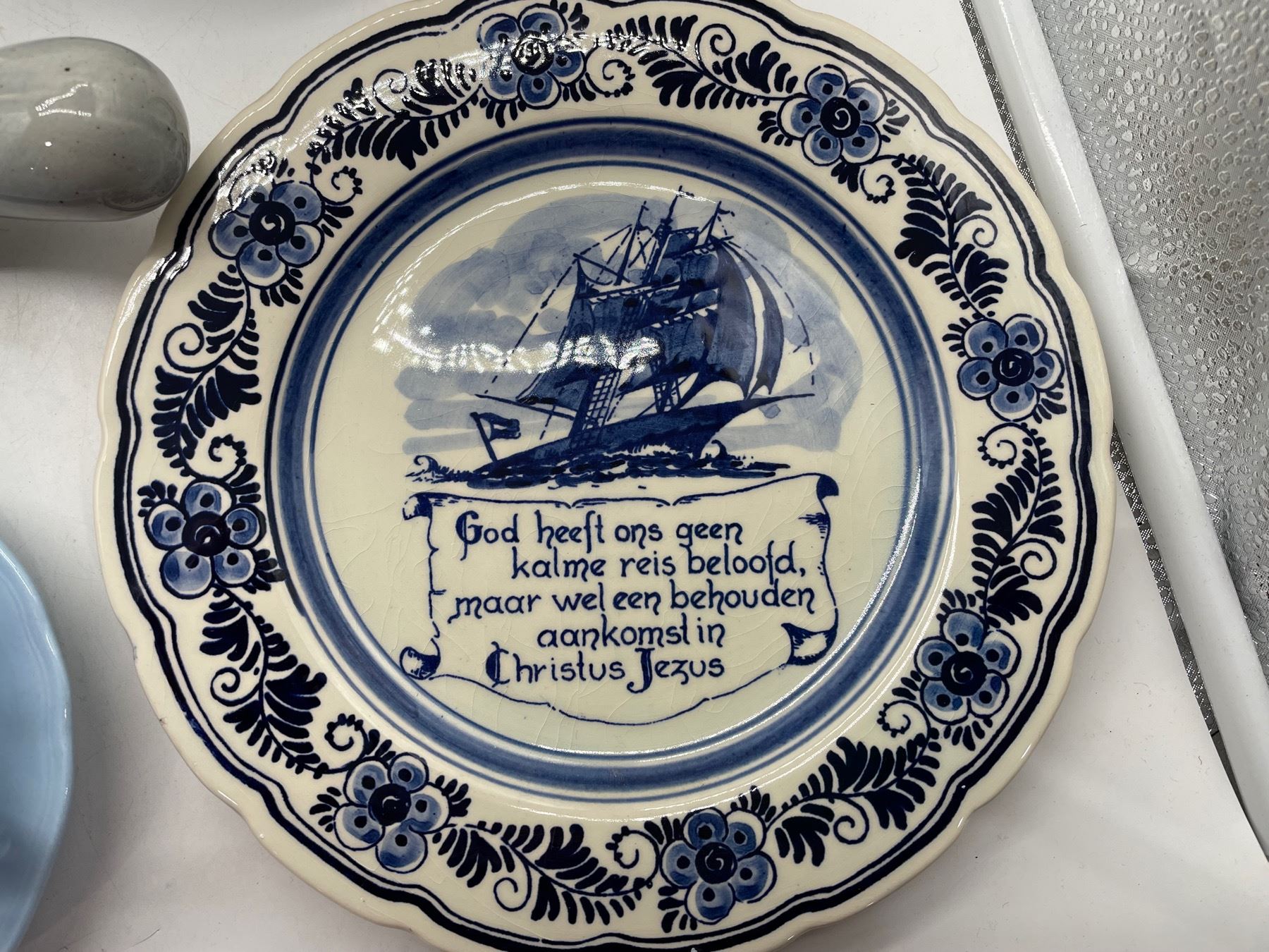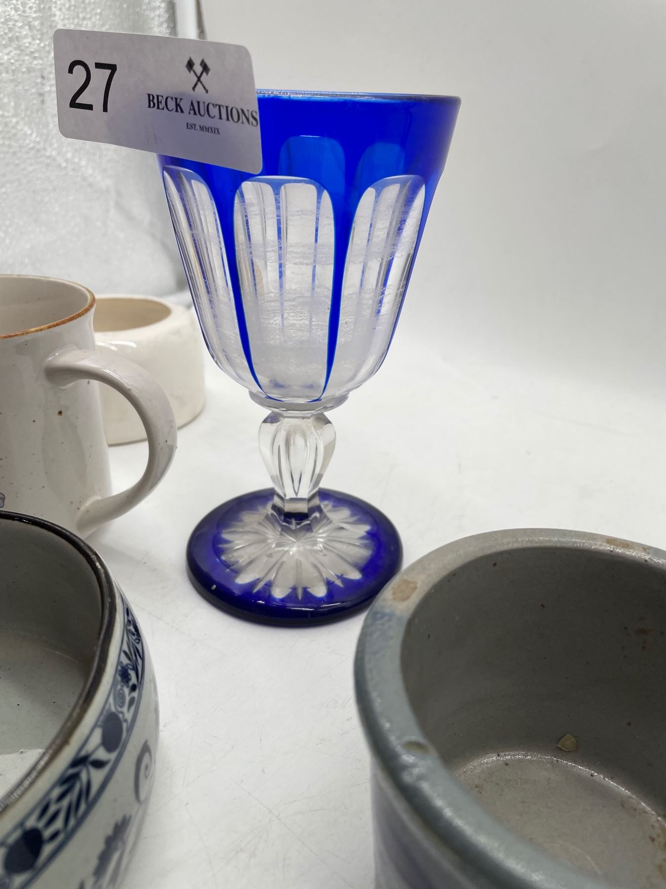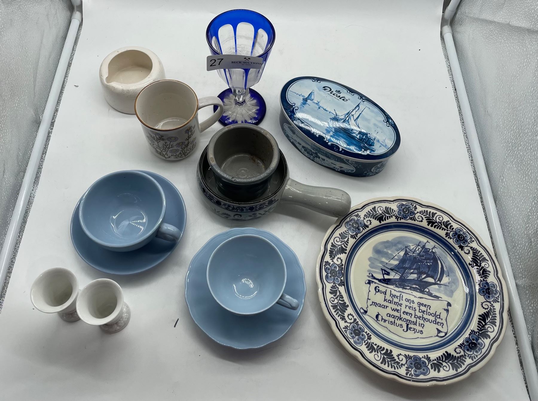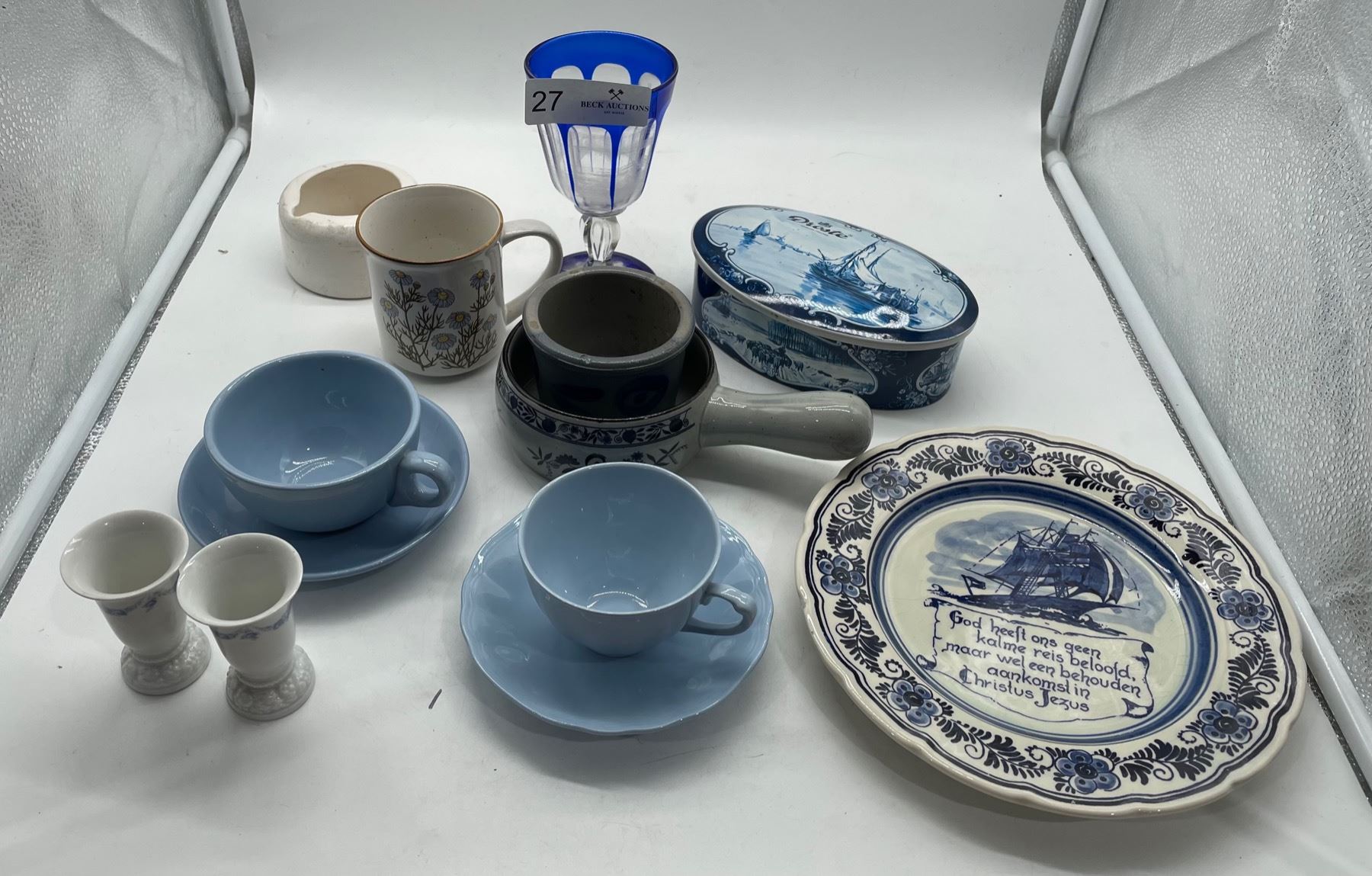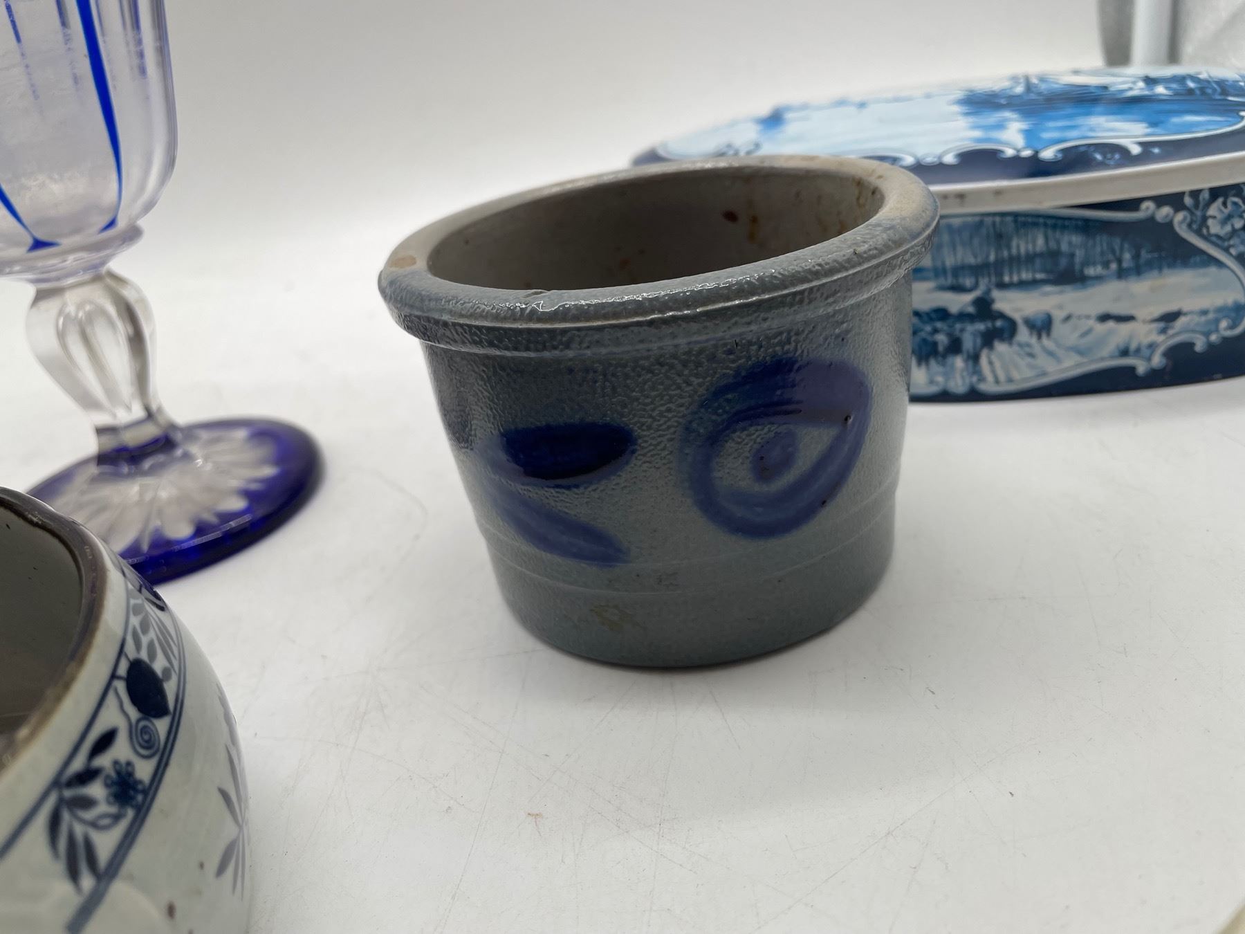 Lot of items consisting of a Delft blue plate (with crazing), Dutch tin can, cut to clear glass goblet, mismatched Grindley England teacups, soup crock, salt glazed little pot, etc.