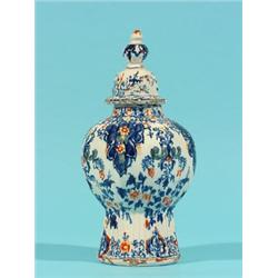Delft polychrome vase with cover, maker's mark with Greek A (1701-1722), h. 16,5 cm. (slight damage to throat, knop is glued)