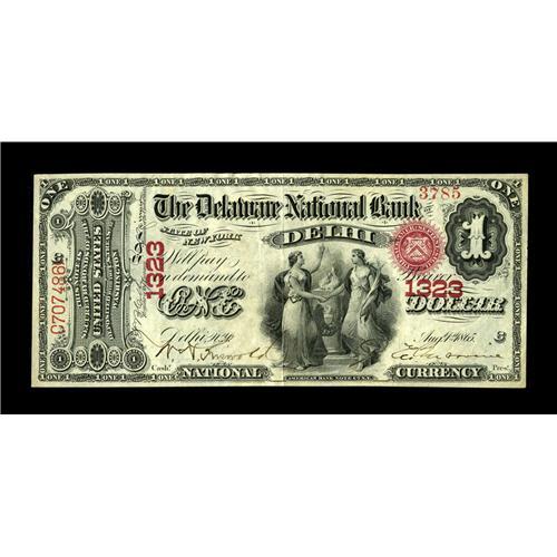 <B>Delhi, NY</B></I> - $1 Original Fr. 380 <B>The Delaware NB</B></I> Ch. # 1323<BR>A beautiful note with perfect centering and incredible color. This variety bears the charter number, which is found only on First Charter aces issued between late 1874 and January of 1879. <B>Extremely Fine.</B></I><BR><BR><b>Shipping:</b> Coin/Currency (<a target="_blank" href="http://www.heritageauctions.com/common/shipping.php">view shipping information</a>)