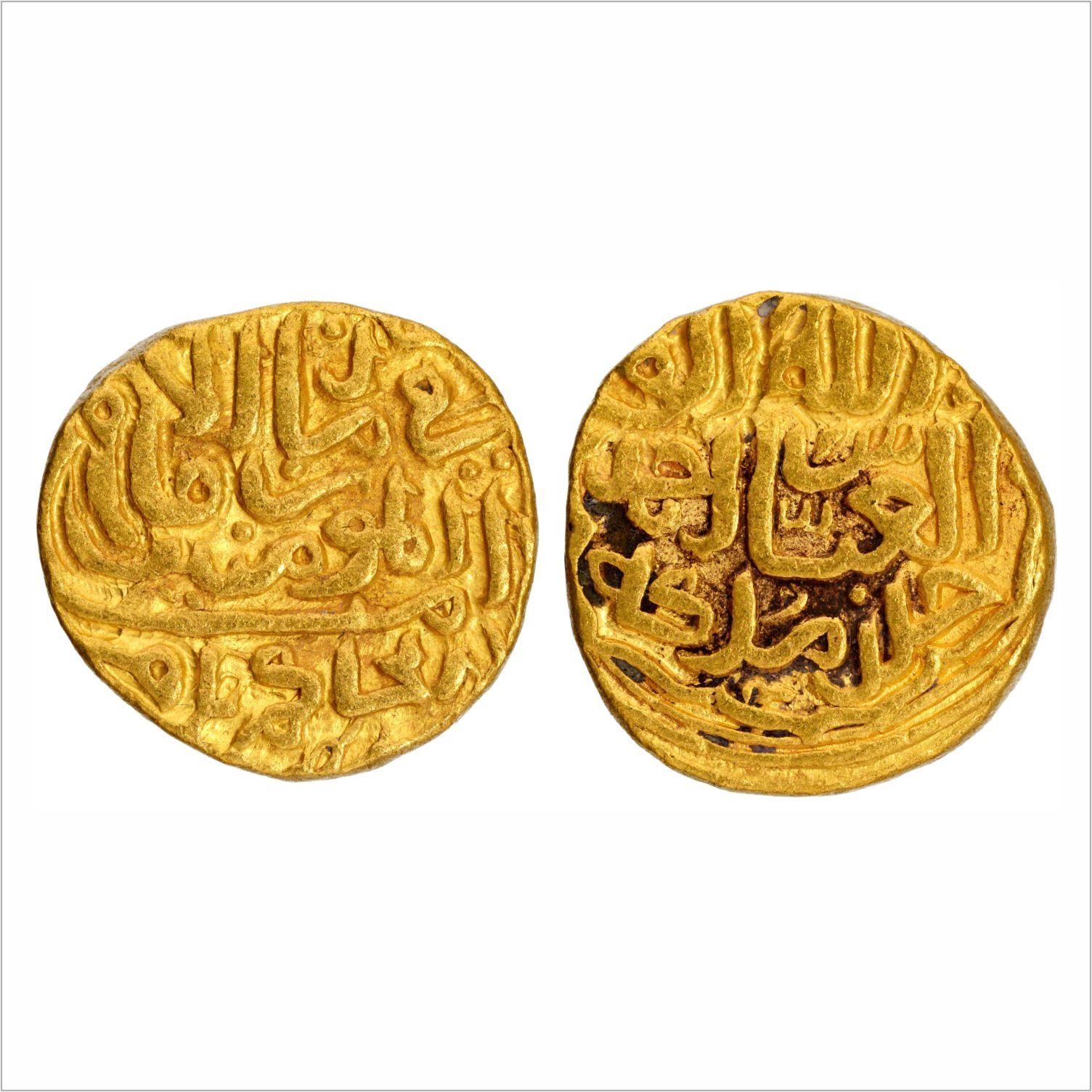 Delhi Sultanate, Muhammad bin Tughluq, Gold Tanka, In the name of Abbasid Caliph Al-Hakim II, 10.80g, Obv: Arabic legend “fi zaman al-imam amir al-mu’minin al-hakim bi-amr”, Rev: Arabic legend “allah, abu’labbasahmadkhuldmulkahu”.