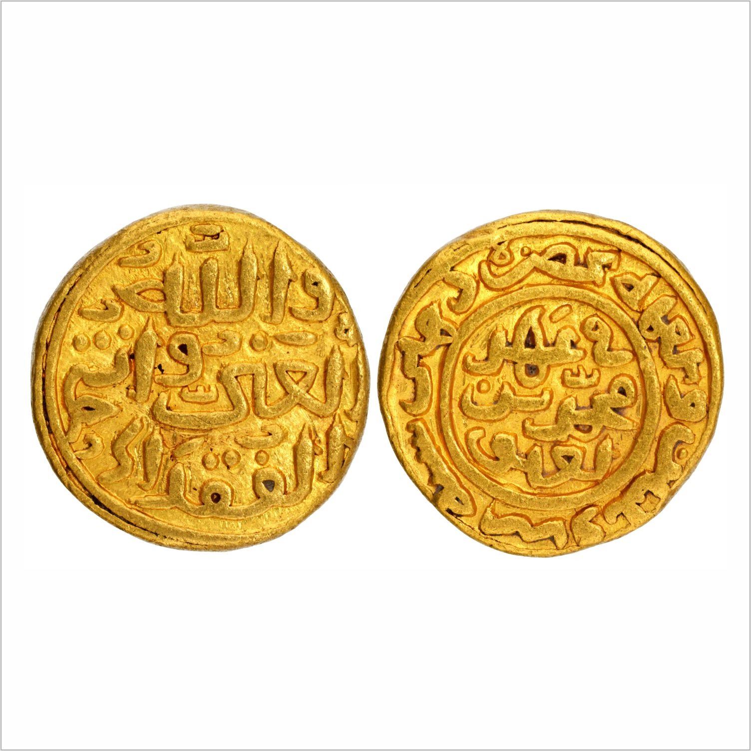 Delhi Sultanate, Muhammad bin Tughluq, Hadrat Delhi Mint, Gold Tanka, 10.97g, Obv: Arabic legend "waallah al-ghaniwaantum al-fuqara", Rev: Arabic legends,"fiahd Muhammad bin Tughluq" within an inner circle, Mint name Hadrat Delhi with Hijri year in the margins.