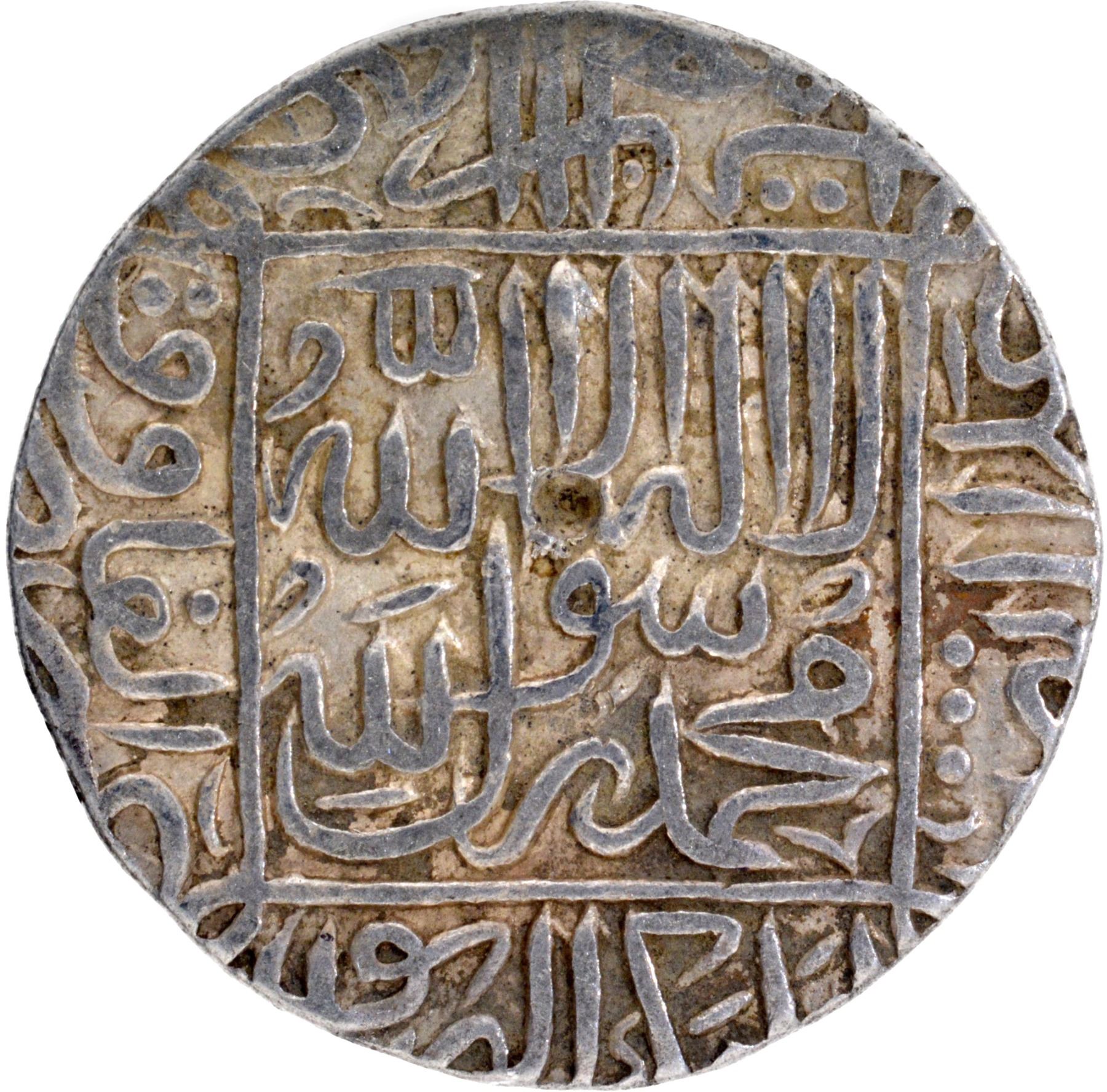 Delhi Sultanate, Suri Dynasty, Sher Shah (AH 945-952/1538-1545 AD), Ranthambhor Mint, Silver Rupee, Large flan, AH 949, Obv: Arabic legendThe Kalama Shahada within a square and the four Caliphs names in the margins, Rev: Arabic legends, Sher Shah sultan khuld Allahu mulkahu Hijri year 949 within an inner square, Sultan-ul-adil Abul Muzaffar Farid-ud-dunya wal din in the margins, Nagari legend Sri Ser Sah Zarb Ranthambhor completely visible at the bottom, 11.23g, 31.11mm, (GG # D794), test marks, original patina, choice extremely fine, Extremely Rare.