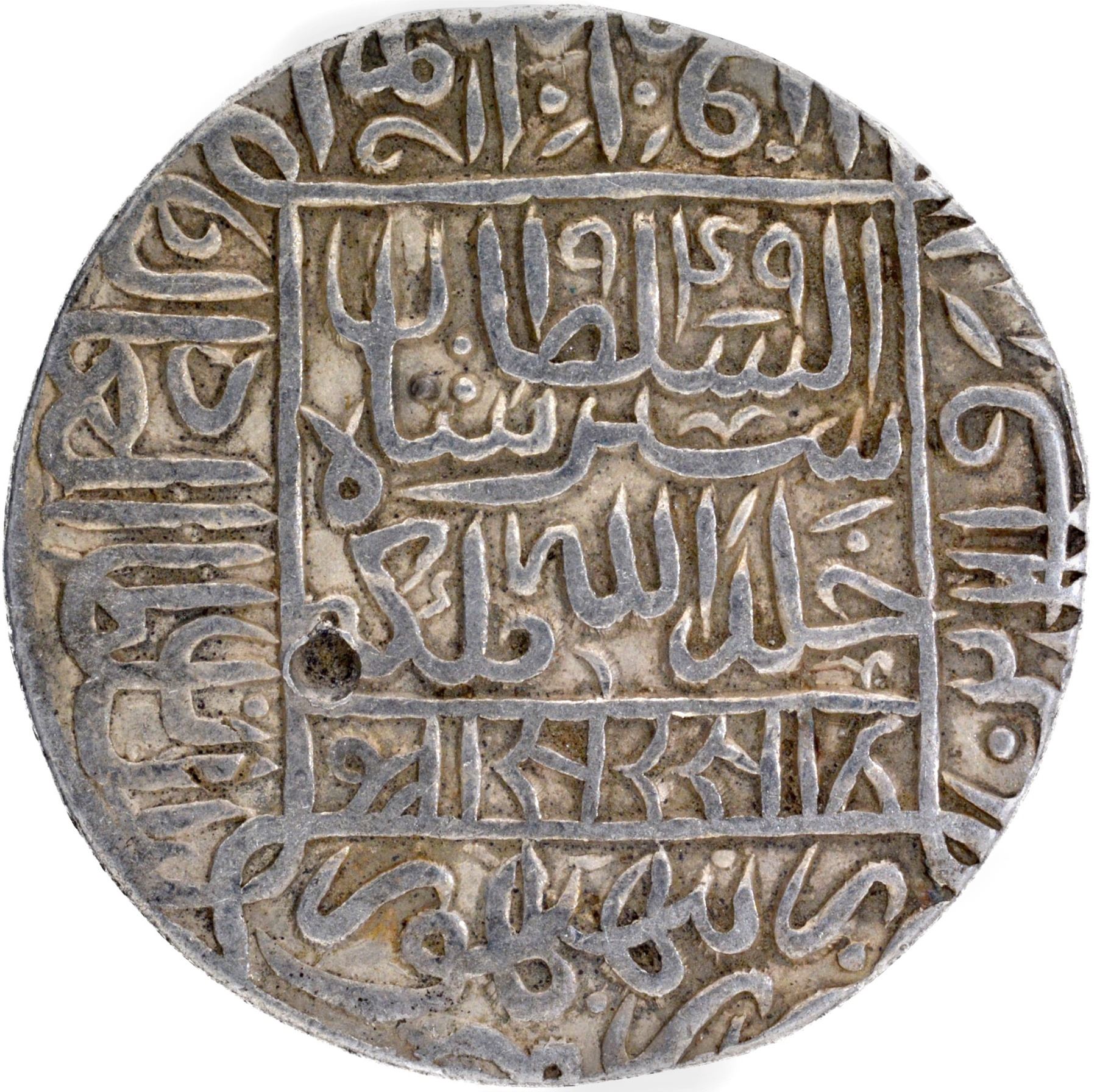 Delhi Sultanate, Suri Dynasty, Sher Shah (AH 945-952/1538-1545 AD), Ranthambhor Mint, Silver Rupee, Large flan, AH 949, Obv: Arabic legendThe Kalama Shahada within a square and the four Caliphs names in the margins, Rev: Arabic legends, Sher Shah sultan khuld Allahu mulkahu Hijri year 949 within an inner square, Sultan-ul-adil Abul Muzaffar Farid-ud-dunya wal din in the margins, Nagari legend Sri Ser Sah Zarb Ranthambhor completely visible at the bottom, 11.23g, 31.11mm, (GG # D794), test marks, original patina, choice extremely fine, Extremely Rare.