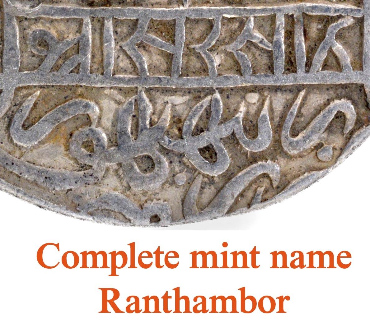 Delhi Sultanate, Suri Dynasty, Sher Shah (AH 945-952/1538-1545 AD), Ranthambhor Mint, Silver Rupee, Large flan, AH 949, Obv: Arabic legendThe Kalama Shahada within a square and the four Caliphs names in the margins, Rev: Arabic legends, Sher Shah sultan khuld Allahu mulkahu Hijri year 949 within an inner square, Sultan-ul-adil Abul Muzaffar Farid-ud-dunya wal din in the margins, Nagari legend Sri Ser Sah Zarb Ranthambhor completely visible at the bottom, 11.23g, 31.11mm, (GG # D794), test marks, original patina, choice extremely fine, Extremely Rare.