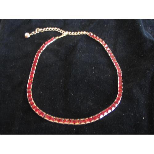 Single strand beautiful cut ruby rhinestones set against rich silvertone. Even stone color no dark stones, ajustable length. 15" end to end