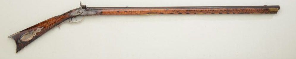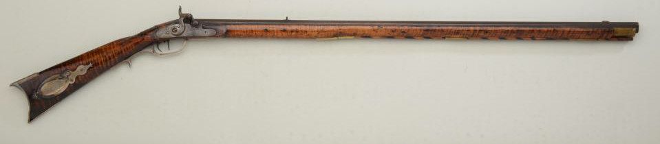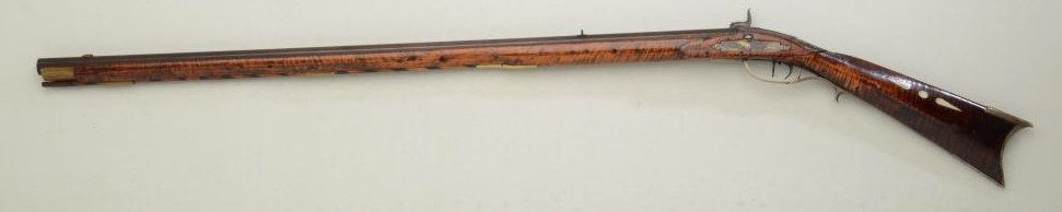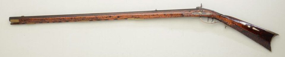 Delicate full stocked Kentucky style rifle converted to percussion, .44 cal., 35” octagon barrel marked “M.F. Yahner”, plum brown patina to barrel with pitting around firing area; double set triggers working attime of description; brass ferrules, trigger guard and butt plate; brass patchbox has been plated, simple inlays on left side of butt stock, full stock with slender wrist and butt; tiger striped wood. This gun is inoverall good condition showing an old repair to the wrist of the gun that was broken long ago and repaired including what likely was a brass or metal wrist plate that was secured by screws of which the screws and plate havebeen removed. A great looking early rifle that is deserving of correct restoration to the wrist of the stock. From an old collection. Est.: $500-$1,000.