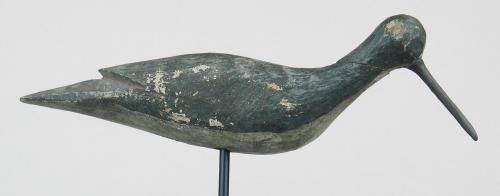 Delicate lesser yellowlegs decoy from the President Grover Cleveland gunning rig. Carved wing tips, in fine OP, light wear on the sides. Struck by a few shot. Bill has been professionally replaced by Steven Weaver. (decoy)