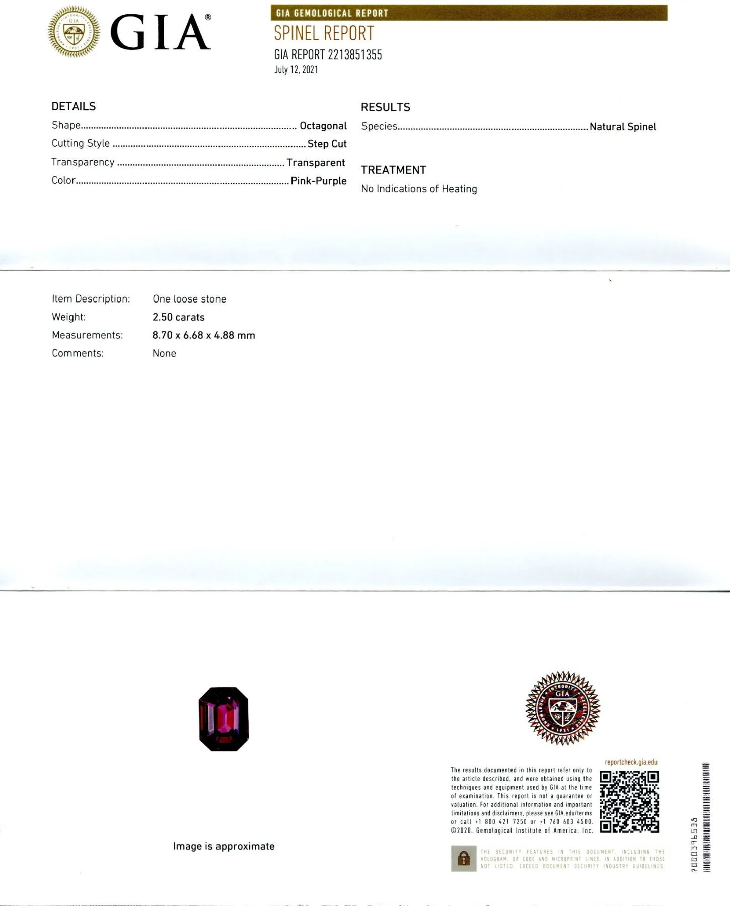 This Unheated VVS1 Eye Clean 2.5 Ct Pink Purple Spinel is an emerald cut measuring 8.70 x 6.68 x 4.88 mm. It is sure to turn heads with its strong saturation and dark tone. Treatment: None. Please see the certification for additional information.