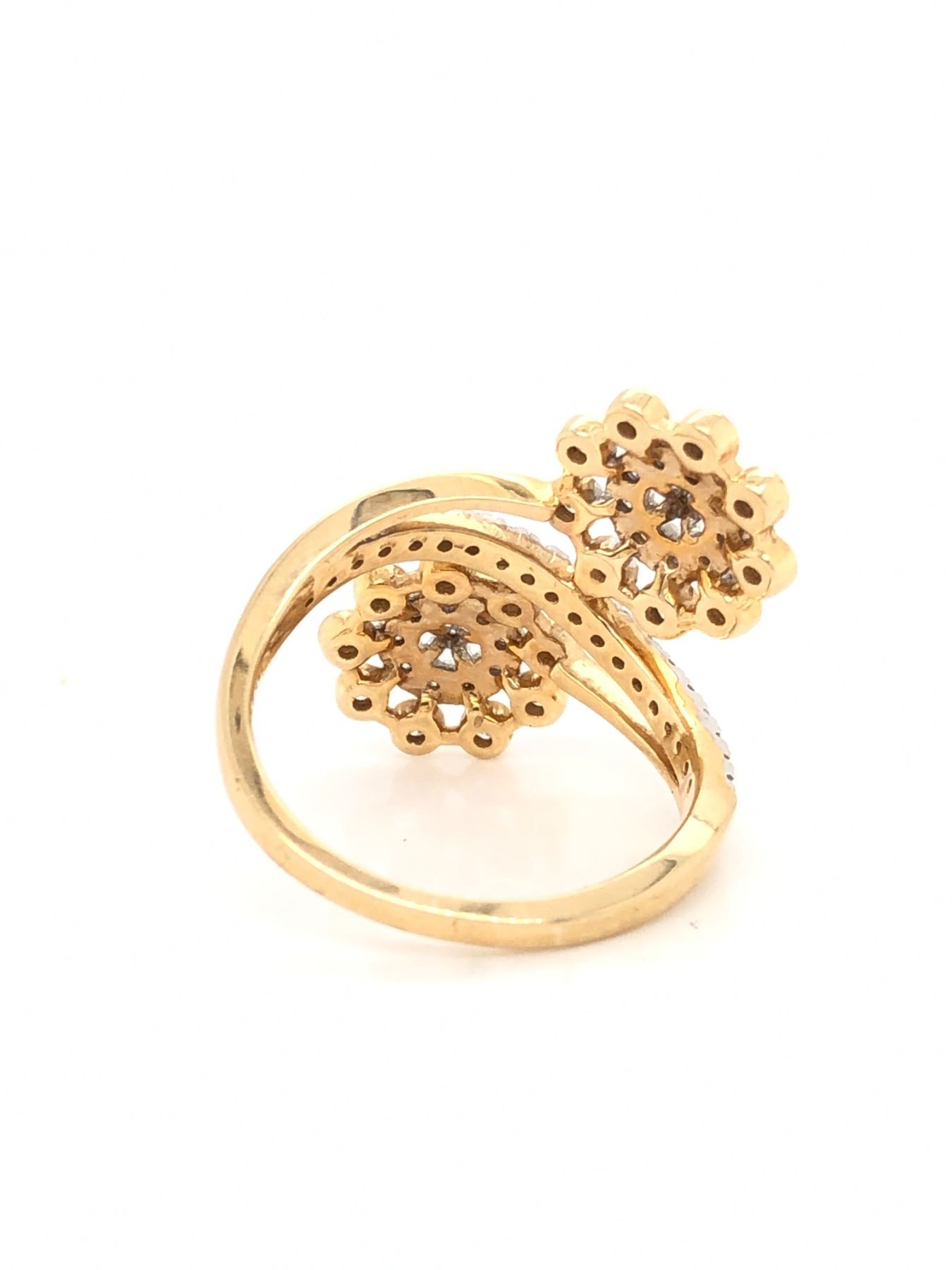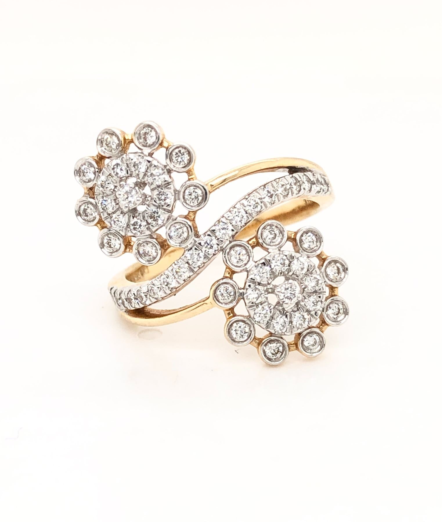 Earth-Mined Diamond Ring.& nbsp; Whether you see intertwined flowers that make you smile, or sprockets and chains that keep everything running smoothly, this is a beautiful and well-made ring!& nbsp; Cast in 14 karat yellow gold, the ring has .56 carats of sparkling round, brilliant-cut, E-F color, SI1-SI2 clarity, prong-set, and beveled diamonds in a flowing design.& nbsp; The ring spans approximately 7/8& quot; along the finger and is US size6 with an approximate 2 mm shank.& nbsp; This ring can be resized for an additional $100, please allow an additional 10 days for shipping if we resize it.& nbsp; This ring is certified and appraised. Appraisal card shown in photos is the actual card and will be enclosed with the ring upon shipment to the winner