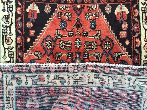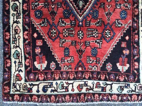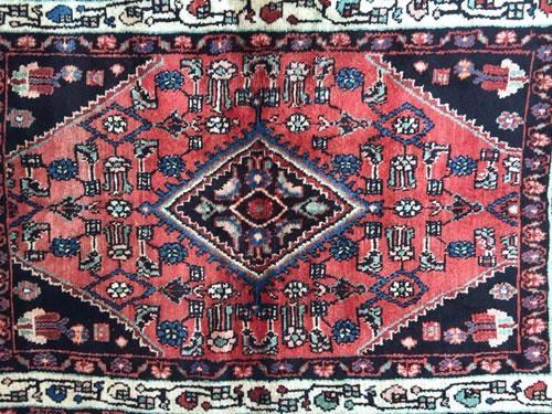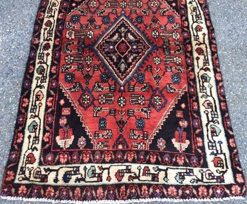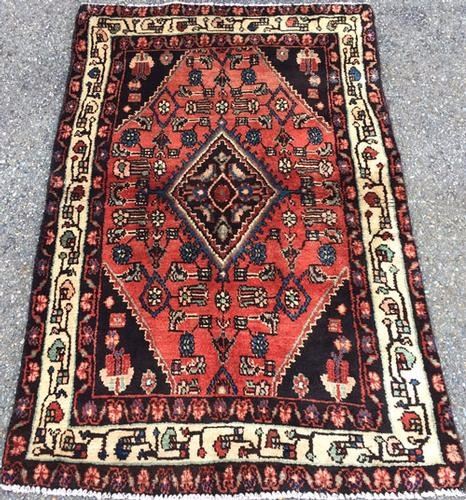 Delightful Hand made Persian Asad-Abad Hamedan. 100%Natural, hand woven, vegetable dye, hand spun, worsted wool pile on cotton foundation. The village of Asad-Abad produces a very limited number of Hamedans. However, the limited few that are produced are superior in terms of wool quality, design and color scheme. It is intriguing to mention that these vibrant and charming pieces are woven by the women of the household with very little education, if any at all. This Asad-Abad Hamedan is a perfect example of man's intrinsic genius striving for beauty and perfection, and in this case, in the form of a hand woven rug, an art underfoot. This piece has a fairly lush pile. Creases are due to fold and not a defect. Size: 5 feet 1 inche X 3 feet 5 inches. Country of Origin: Iran.
