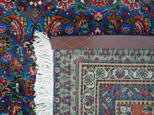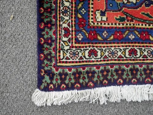Delightful and Intricate Hand woven Persian Tabriz Rug Made of fine quality baby lamb's wool on cotton foundation, all natural vegetable dye, incorporating a hybrid geometric and floral pattern with a beautifully contrasted dual headed multicolor central medallion on a navy background and finished off beautifully with an intricately done geometric borders. Hand knotted by master weavers in Tabriz, Iran. Size 13.2 x 10.3 feet.